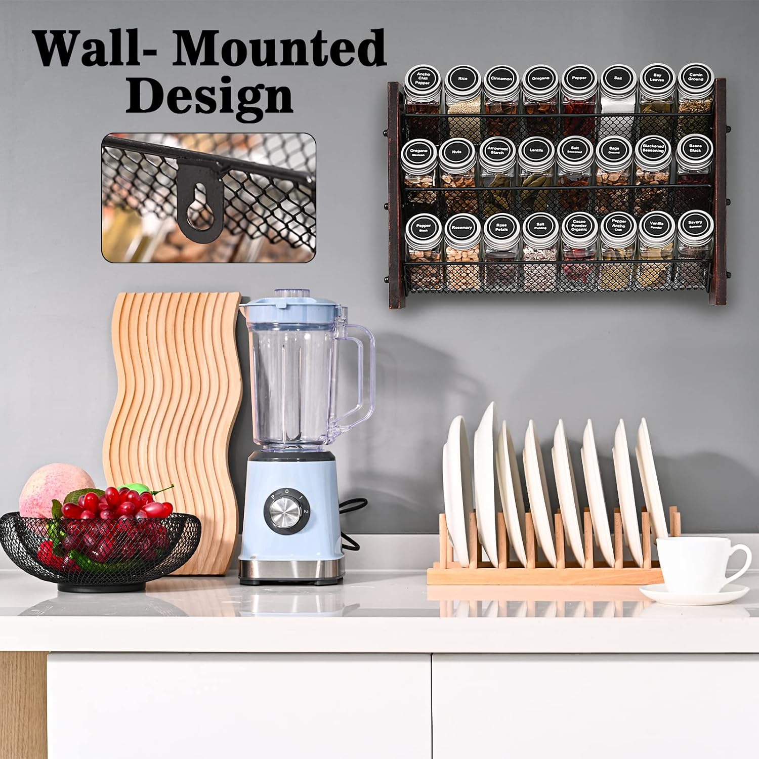 - Sturdy Material: The spice rack organizer is made of solid wood on both sides. The mesh tray is made of iron, coated with waterproof and anti-rust paint. The sturdy construction is the solution to your storage problems. It is without jars