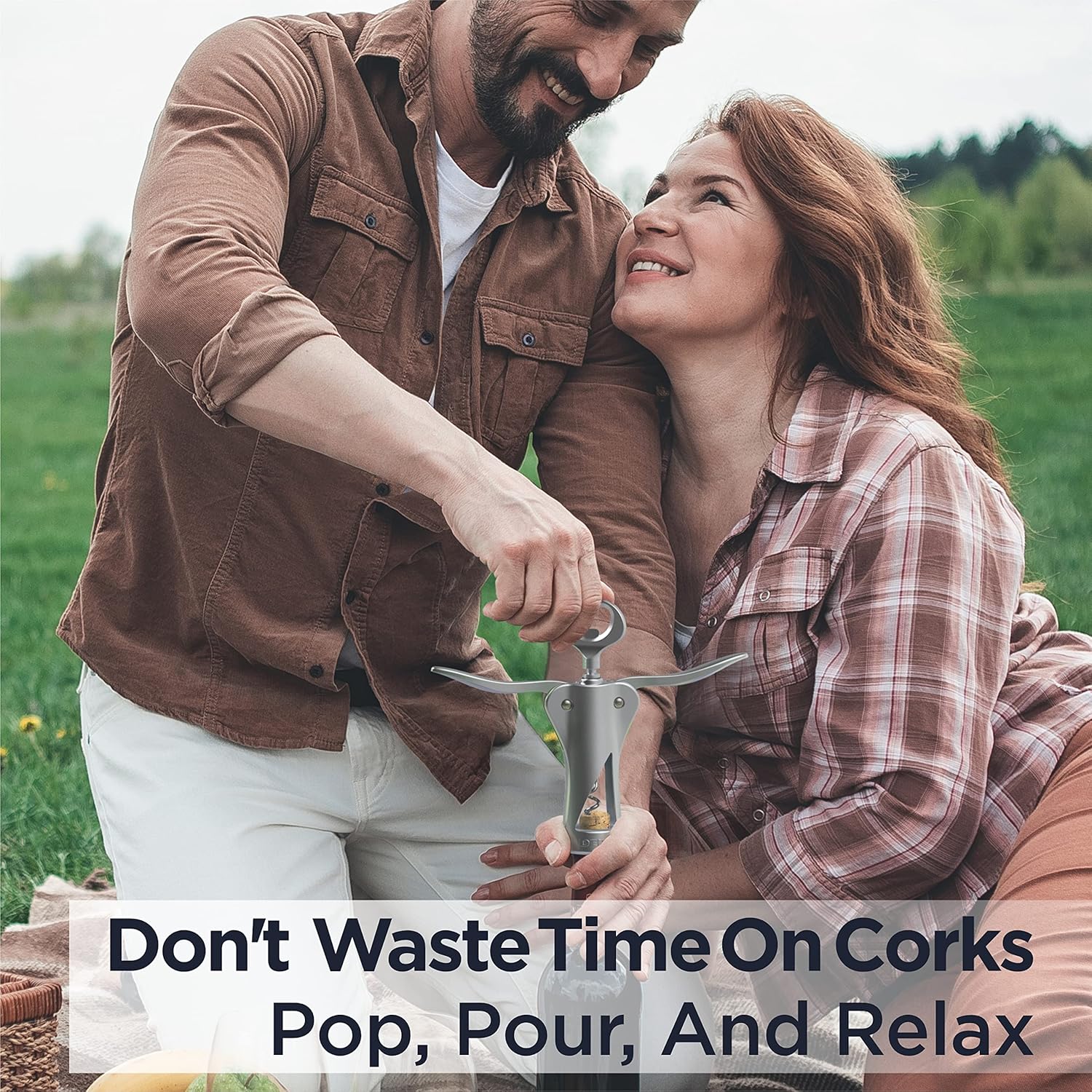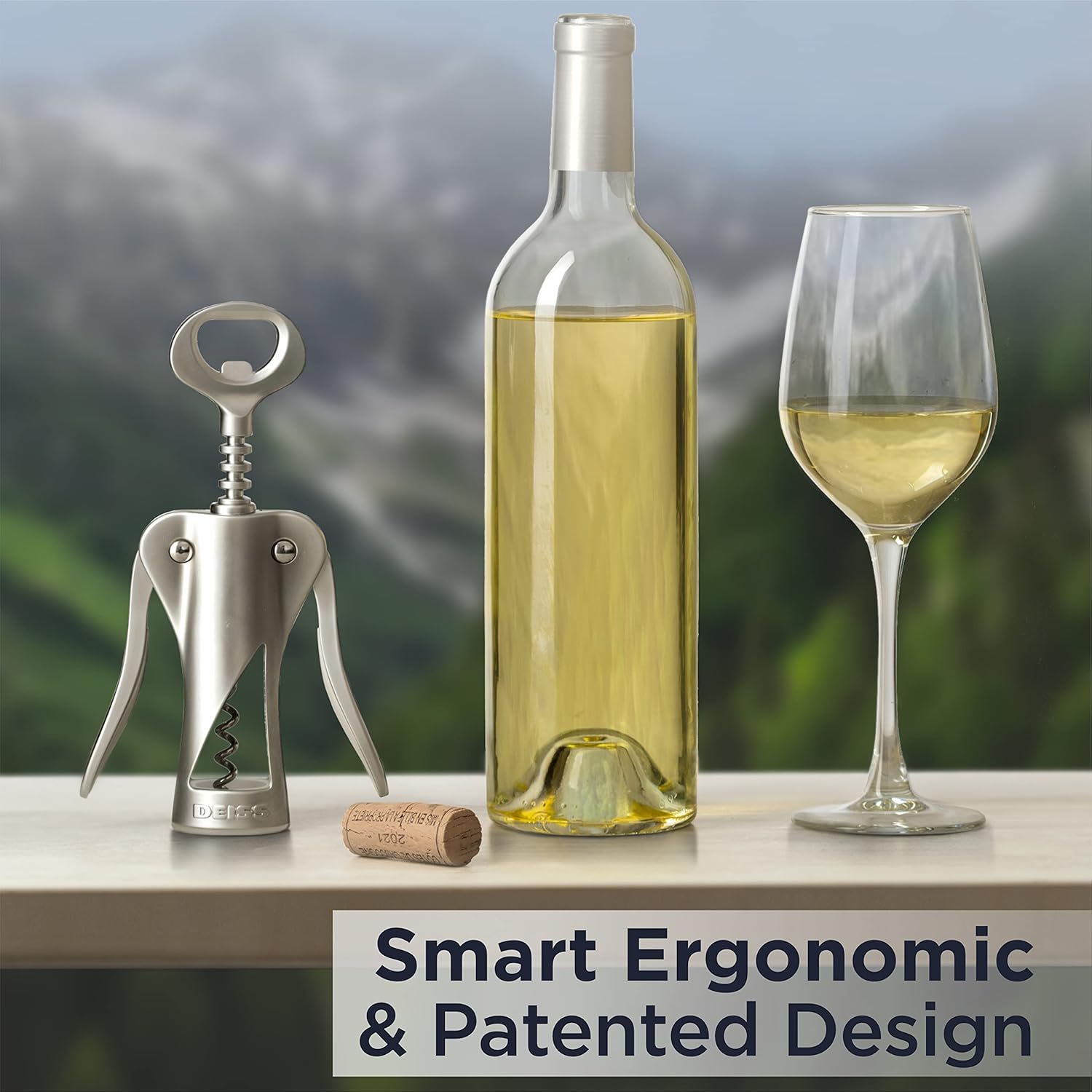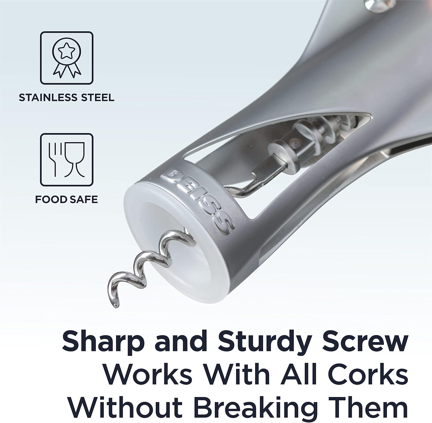 Deiss LUX Wine Opener, All-Metal Wing Corkscrew Wine Bottle Opener with Built-in Beer Bottle Opener - Ergonomic Cork Screw Wine Corker, Silver Matte Coating, Velvet Storage Pouch (SILVER)