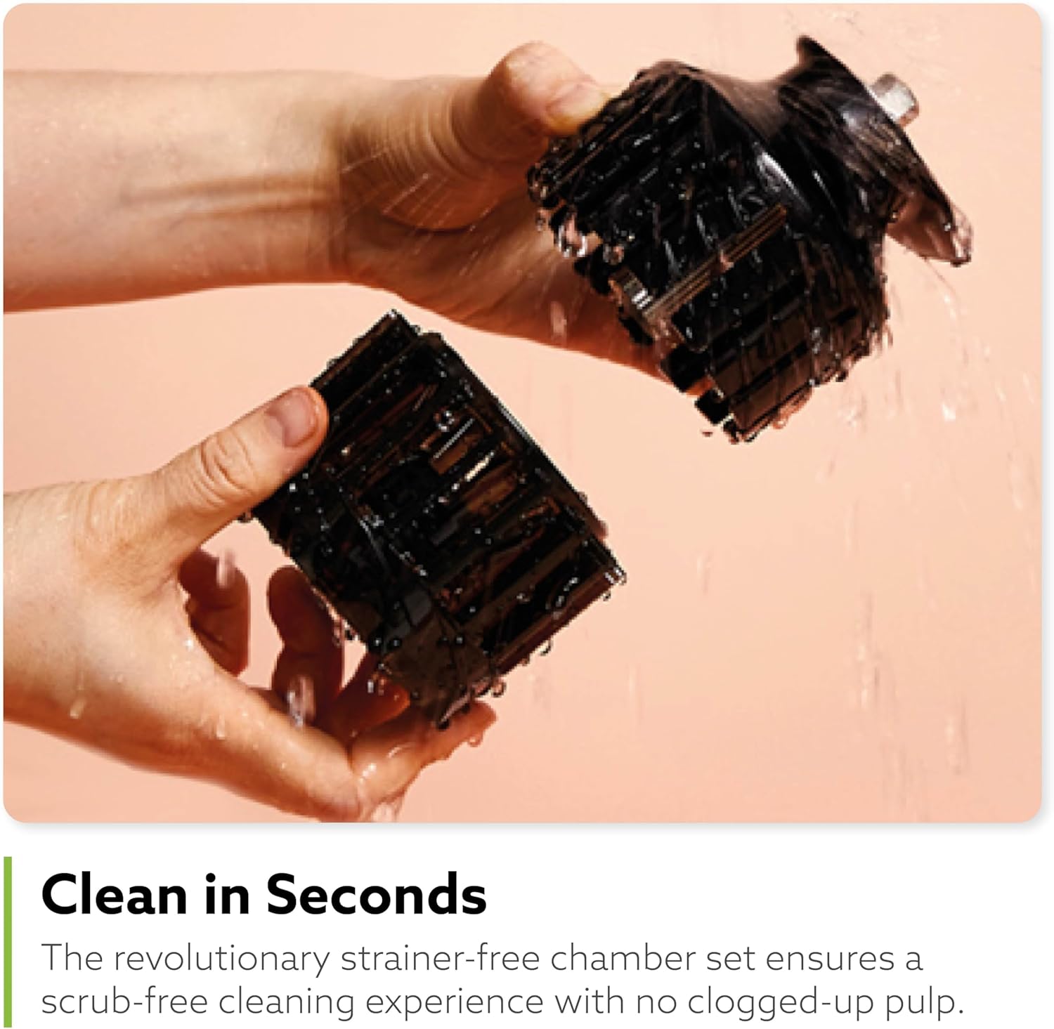 - STRAINER-FREE - Traditional juicers require a strainer which collects minerals over time, requiring extensive scrubbing. The H400 utilizes a revolutionary mechanism that minimizes pulp - even without a strainer. The strainer-like function is practically embedded within the chamber and the two-part auger meshes together to strain out pulp-free juice – which means bare minimum cleaning for high-quality juice!