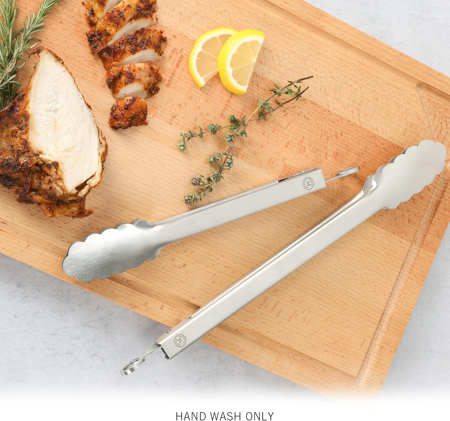 - WHAT'S IN THE BOX: Two stainless steel tongs (9-inch, 12-inch)