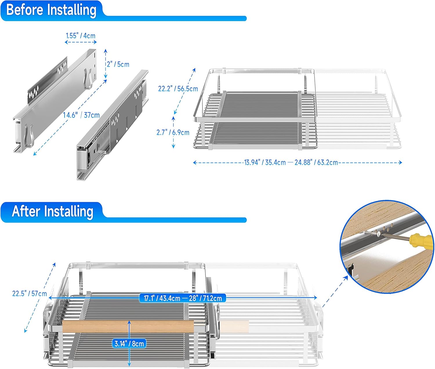 - ✔【Pull Out Drawers for Kitchen Cabinets with Adjustable Height】The improved slide out cabinet organizer is more flexible than the traditional pull out cabinet organizer; Its guide rail is installed on the side of the cabinet rather than the bottom of the cabinet; So it can be installed at any height; You can adjust the height of the installation basket according to your comfort; Note: Avoid the hinge of the cabinet during installation