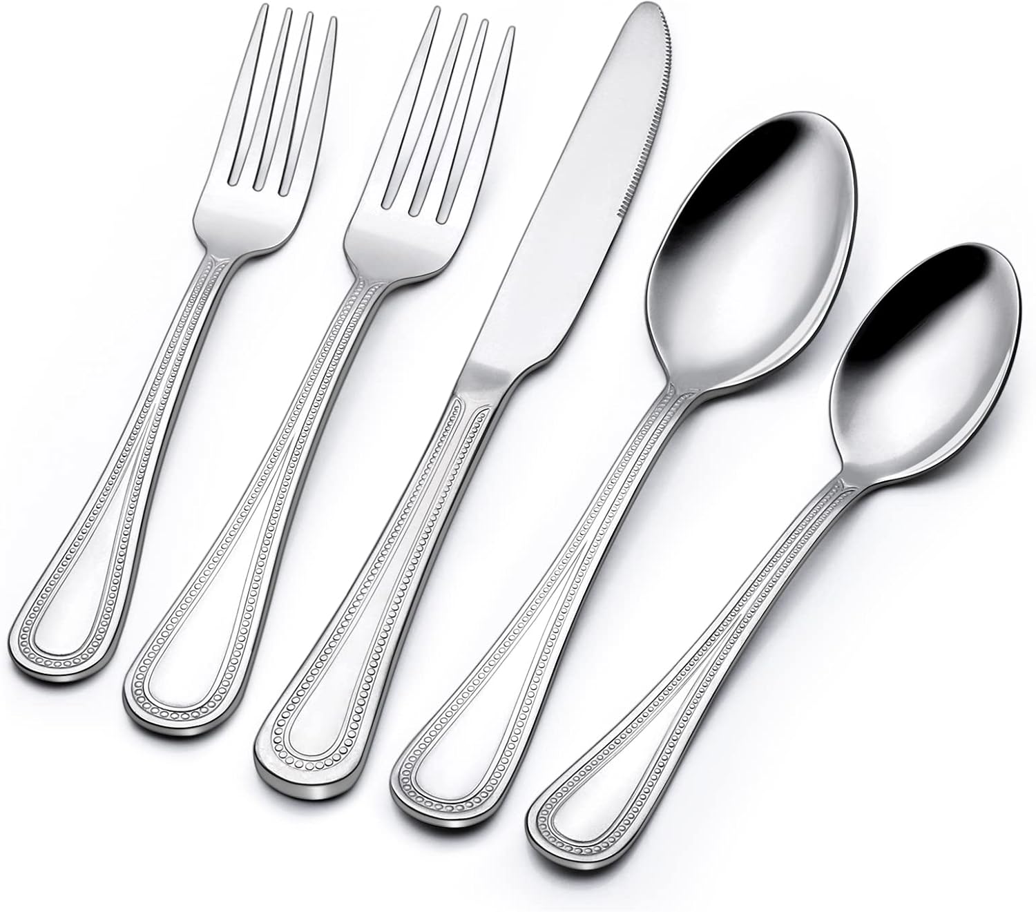 - 【CLASSIC STYLE WITH BEADED HANDLE DESIGN】 The flatware set features teardrop handles embellished with a beaded border and rounded end. The classic, timeless beaded pattern in the handle border looks like gleaming jewelry, which is gorgeous and can enhance elegance to our table.