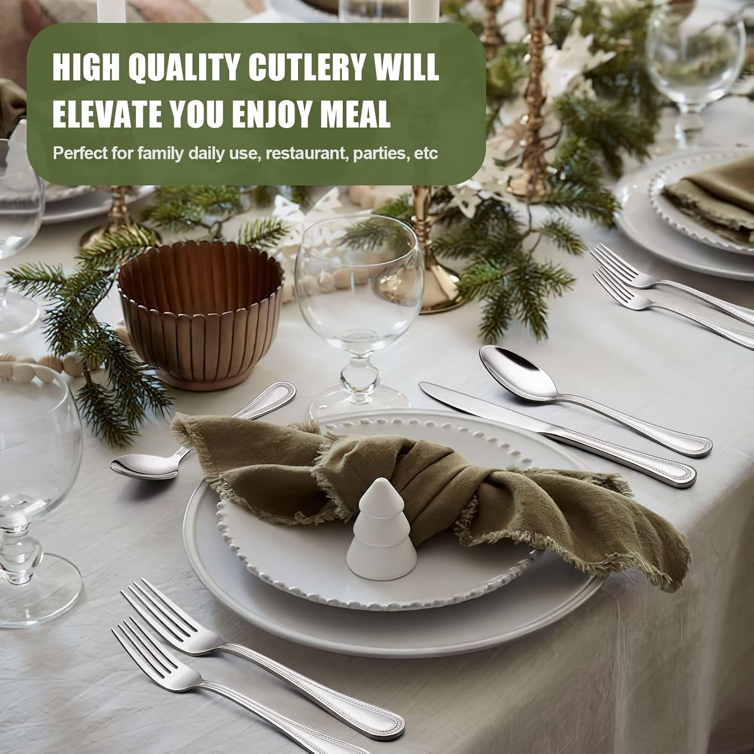 - 【ADD ELEGANCE TO TABLE】This cutlery set is a nice compromise between modern and classic thanks to its sleek, simple beaded design and bright mirror finish. Whether your style is traditional or modern,this flatware will complement your decor and never look dated. The elegant utensil set is perfect for family daily use, parties, family dinner, wedding, hotel, restaurant, formal dinner, etc.