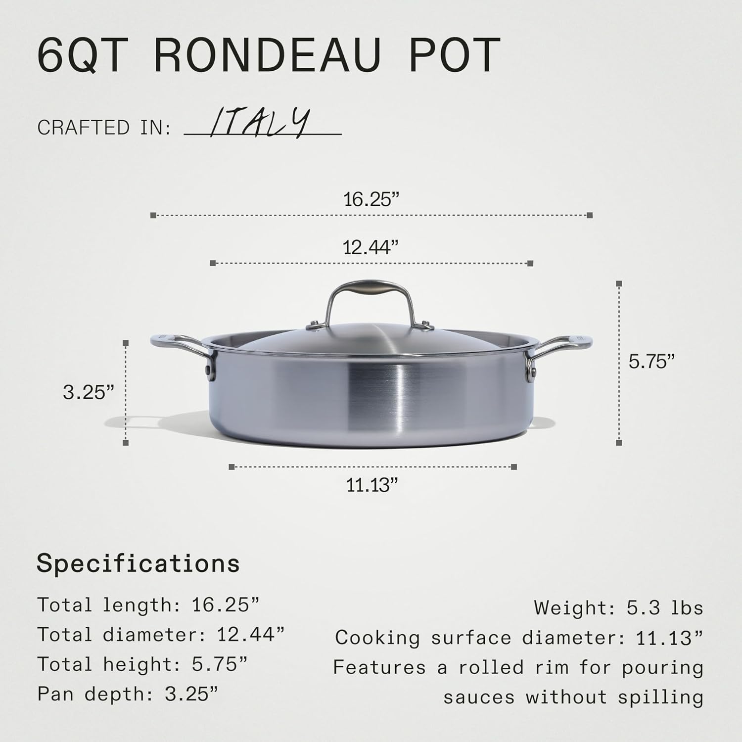 Made In Cookware - 6 Quart Stainless Steel Rondeau Pot w/Lid - 5 Ply Stainless Clad - Professional Cookware - Crafted in Italy - Induction Compatible