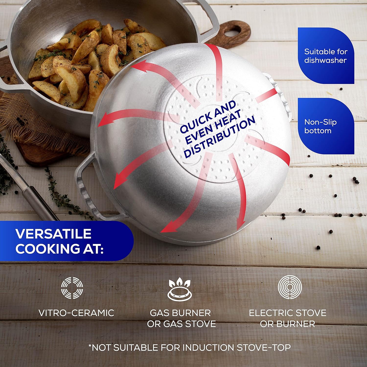 - 🔥 Expertly Engineered for Faster, Even Cooking: Crafted from premium stainless cast aluminum, this lightweight yet ultra-durable pot rapidly distributes heat across its surface, reducing cooking times while preserving flavors and nutrients. Perfect for high-output kitchens, it ensures that every dish, from savory rice to rich stews, is cooked evenly and efficiently. Plus, the non-stick interior makes cleanup effortless.
