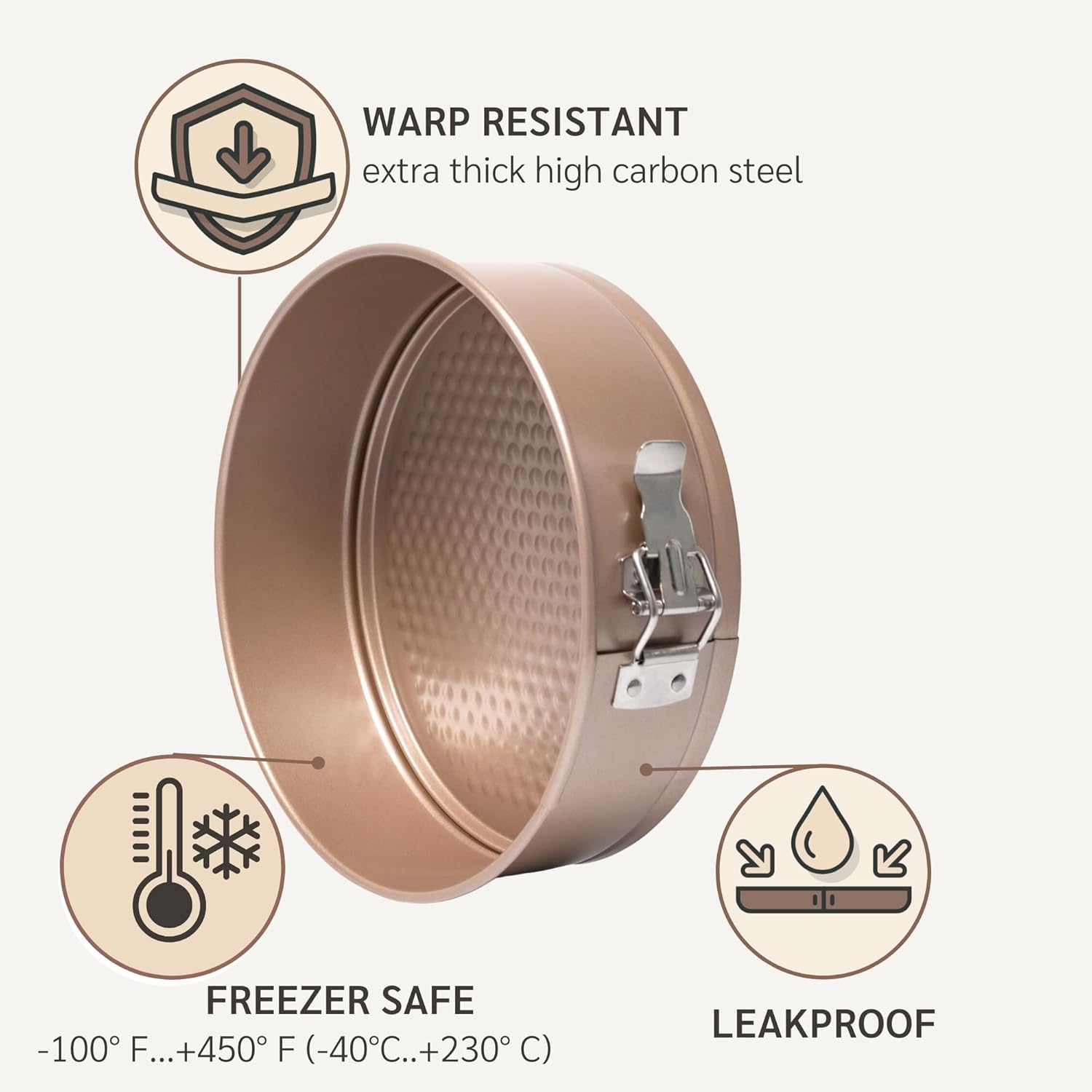 - 💯 Superior Heat Conduction – made from high quality carbon steel, this springform cake pan heats evenly and eliminates hot spots, avoiding burnt or undercooked cakes. Extra thick construction ensures uniform baking and long-lasting durability.