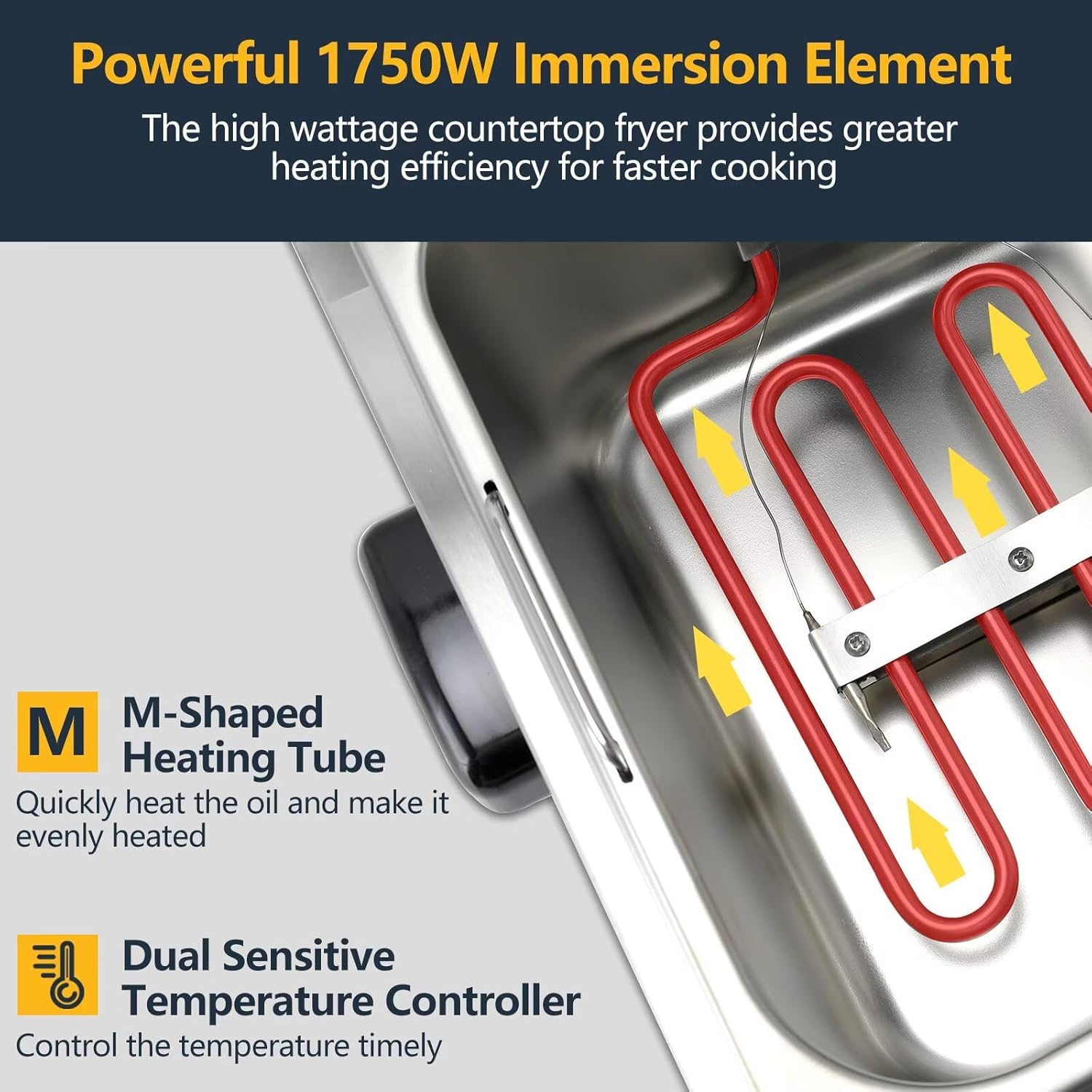 - 🍟【POWERFUL COMMERCIAL DEEP FRYER】This electric countertop deep fryer is equipped with a powerful 1750W heating element to fry food quickly; provides greater heating efficiency for faster cooking and reducing recovery time, designed to keep up with your heavy-duty commercial usage requirements at restaurants, supermarkets,fast food stands,snack bars, food truck and parties. Suitable for frying chips, fish, chicken, egg rolls, doughnuts, onion rings,shrimp,jalapeno poppers,mozzarella sticks,etc.