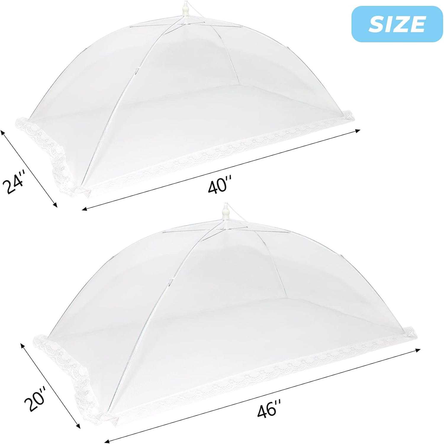 - SUPER SIZE:2 big sizes of 46"x20", 40"x24" food tent covers make more use scenarios and can be reused. The bottom of the foldable food cover has a moderate lace edge, which acts as a barrier and is an effective food net. A variety of large sizes make your party food more secure.