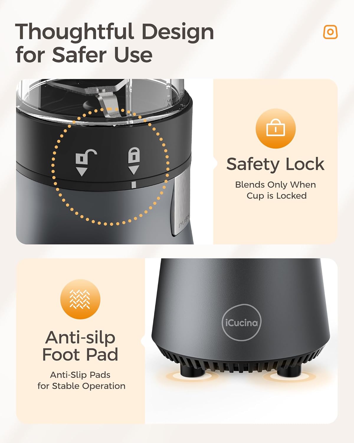 iCucina Smoothie Blender, Personal Blender for Shakes and Smoothies, 500W Pulse Technology Single Serve Blenders with 2 x 28oz Protable Cups for Ice Crush, Frozen Fruit Drinks