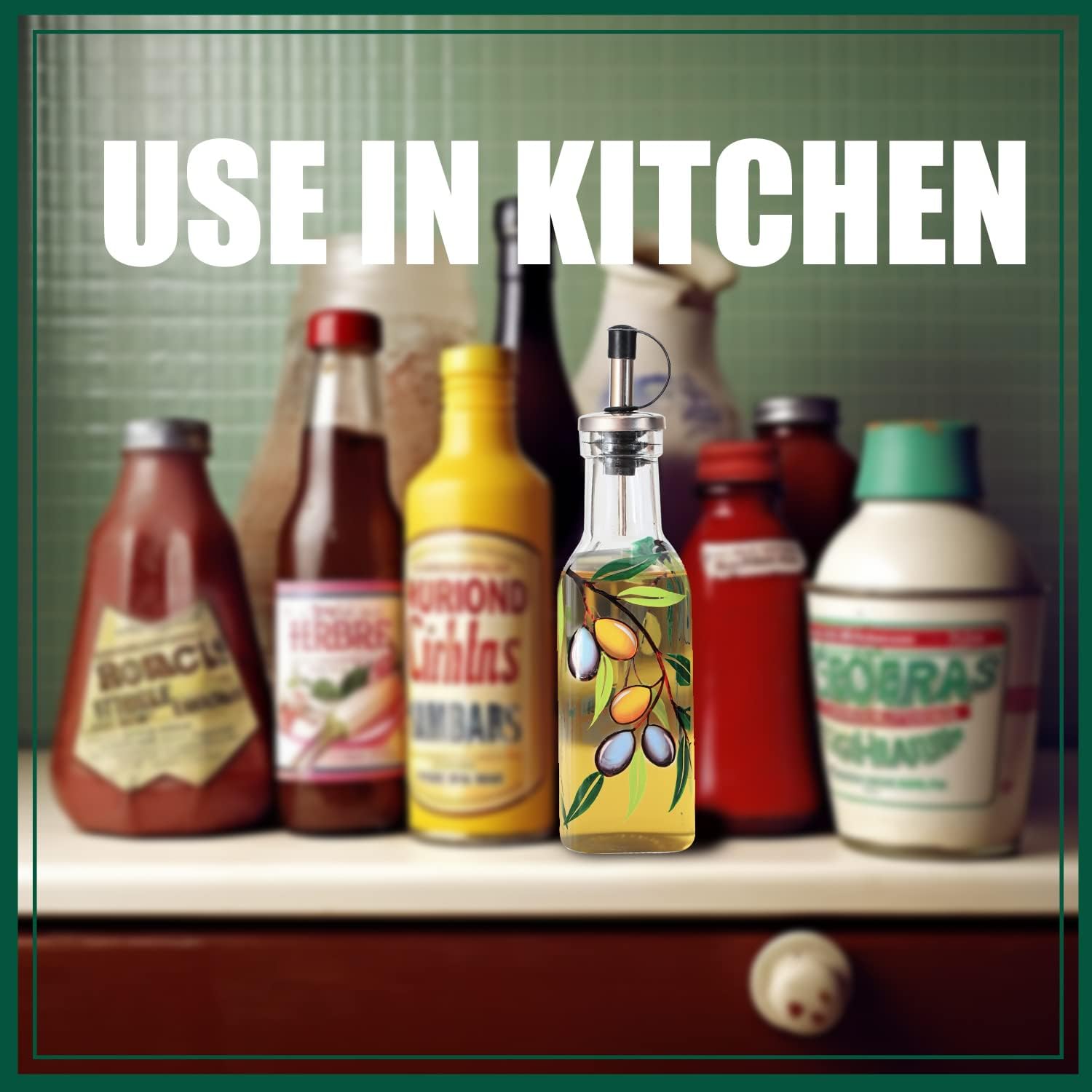 - YIYUKODELEGANT OLIVE OIL DISPENSER - YIYUKODO handpaninted glass olive oil bottle with spout stoppers make it easy to dispense oil with appropriate amount - Get less oil consumption and healthier eating. 7oz Glass Olive Oil Bottle