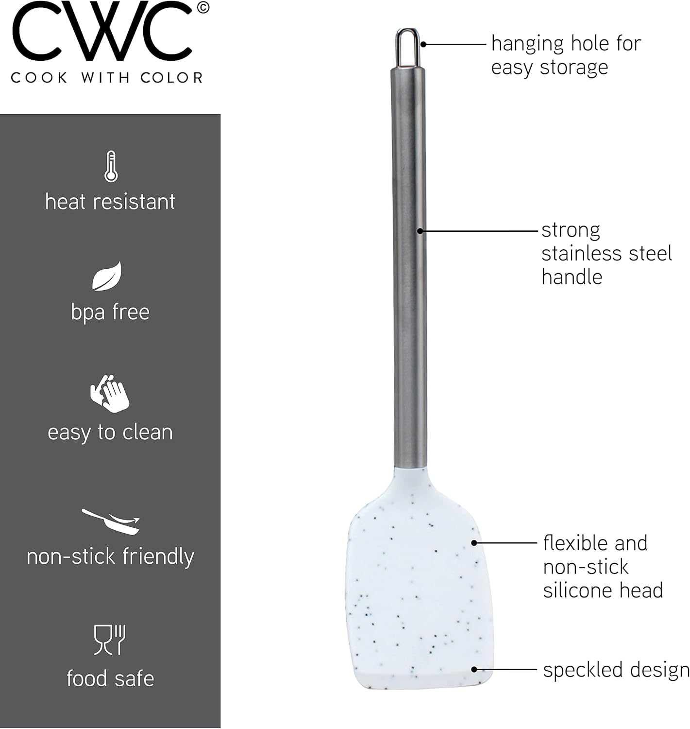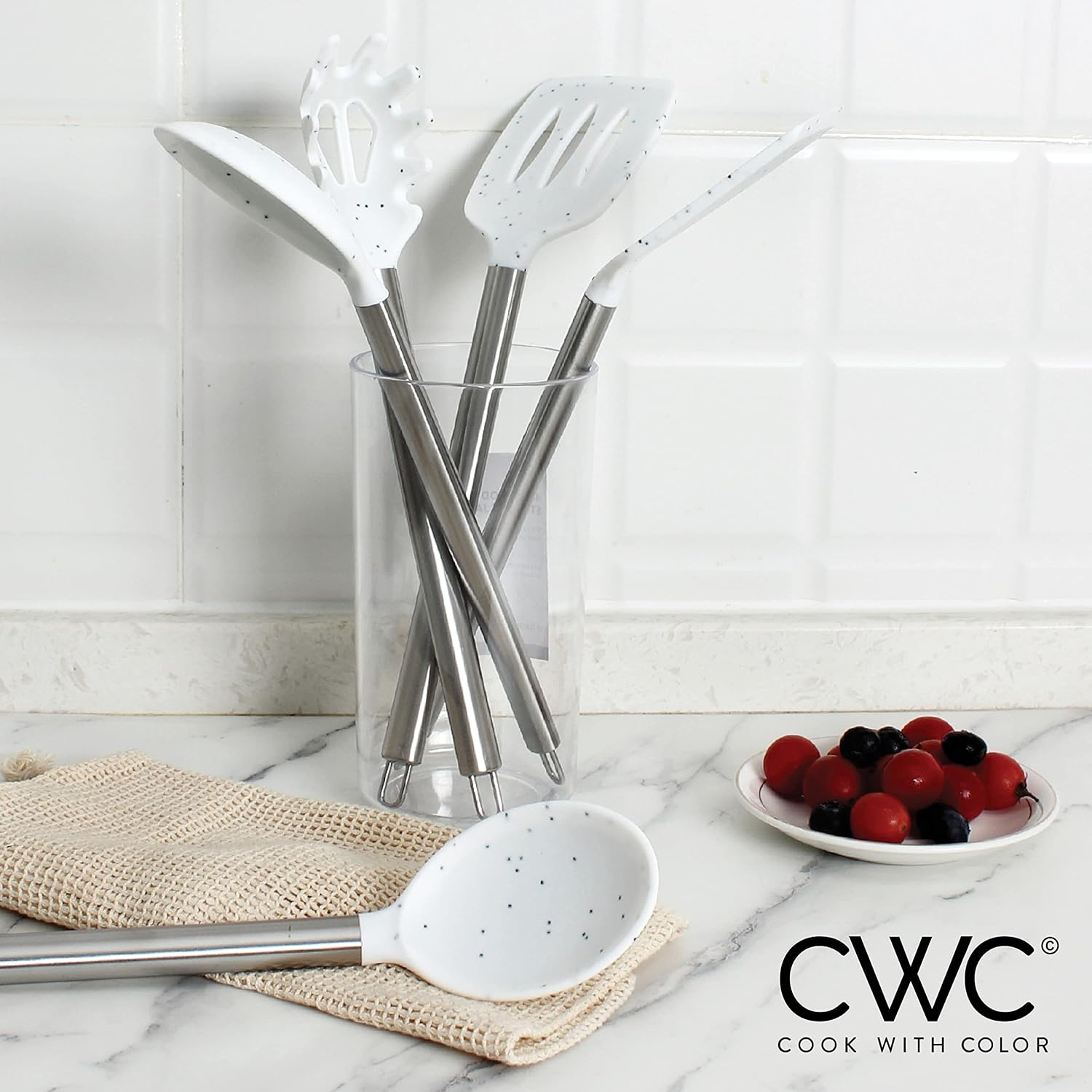 - White Speckled set, this set of silicone kitchen tools has an up to date, trendy look that is madly in line with the current styles and trends. Add a splash of color and funk to your kitchen and hang from the rings on each utensil.