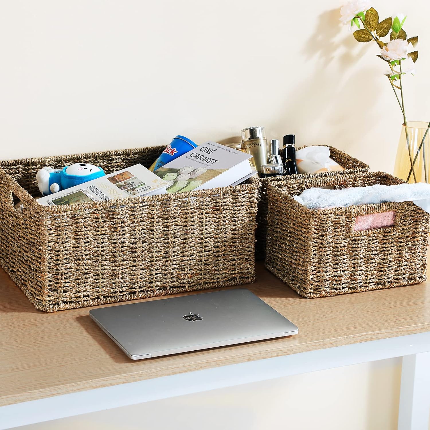 HOONEX Large Wicker Baskets for Storage, Seagrass Baskets with Dual Handles, Woven Baskets for Storage, Set of 3, Natural