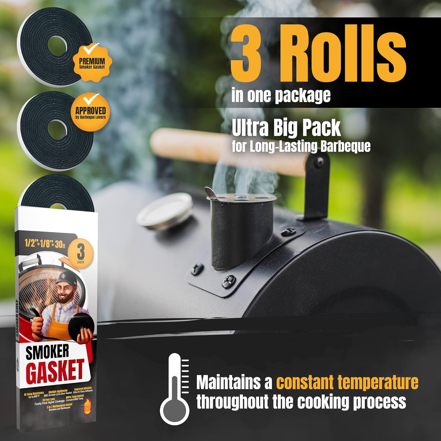 - ✔️ [ UNIVERSAL SIZE ] Our 3 rolls Smoker Chef grill gaskets for smokers are 30 FEET long in total, 10 FEET each, which will ensure a higher coverage. It is suitable for a large variety of BBQ Smokers/grills. It is compatible with Masterbuilt, Weber Smoker, Traeger, Char-Griller Charcoal grill, Kettle Charcoal grill, Oklahoma Joe, Camp Chef pellet smoker, etc. Choose our high temperature gasket smoker for good & durable results compared to other nomex gaskets.