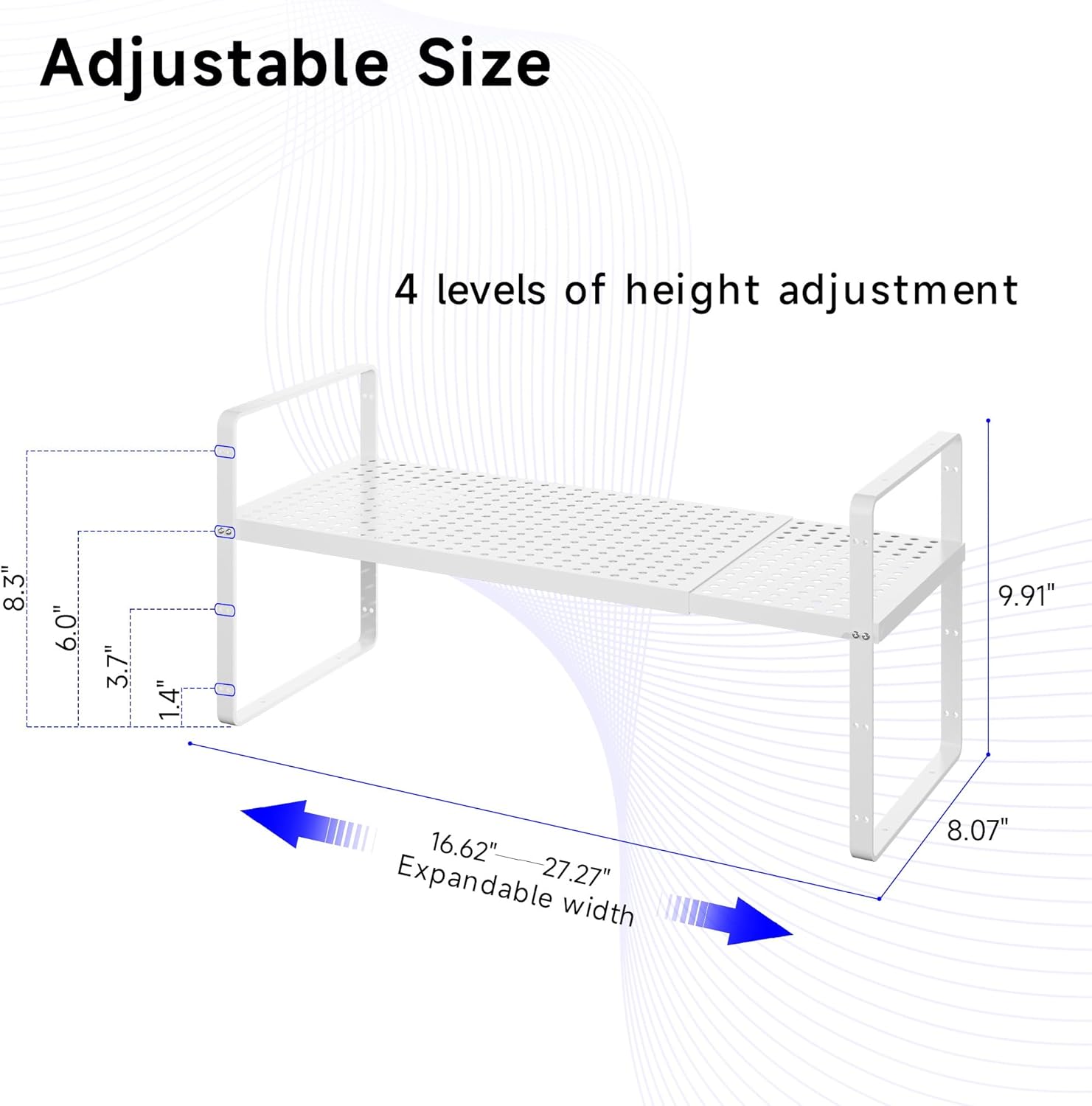 - 【Versatile and Customizable】 With its adjustable width and height, this cabinet storage organizer can fit into any cabinet or cupboard, making it perfect for customizing your storage space to meet your unique needs. The small one measures 8.07" D x 16.62-27.27" W x 9.91" H.