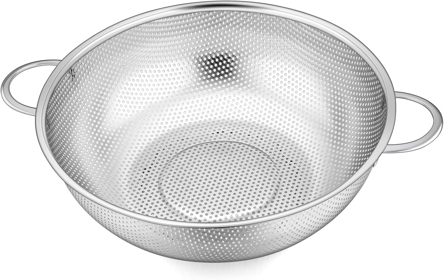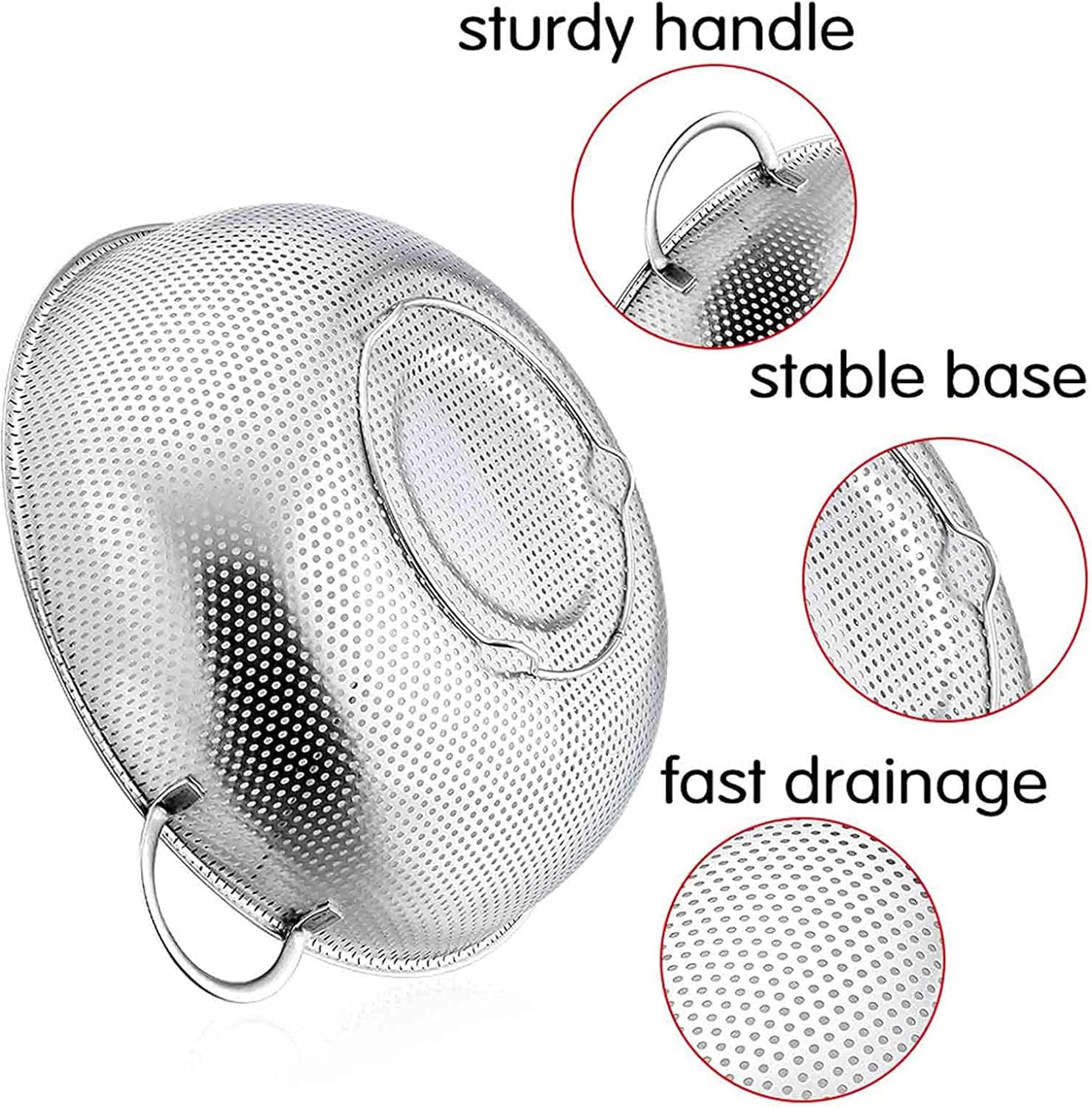 - QUICK DRAINING – Closely spaced holes on the whole surface for draining water faster and without tilting the metal strainer to avoid the food flowing out, Tiny holes for no worry about small foods(nuts, spaghetti, noodles) slipping through