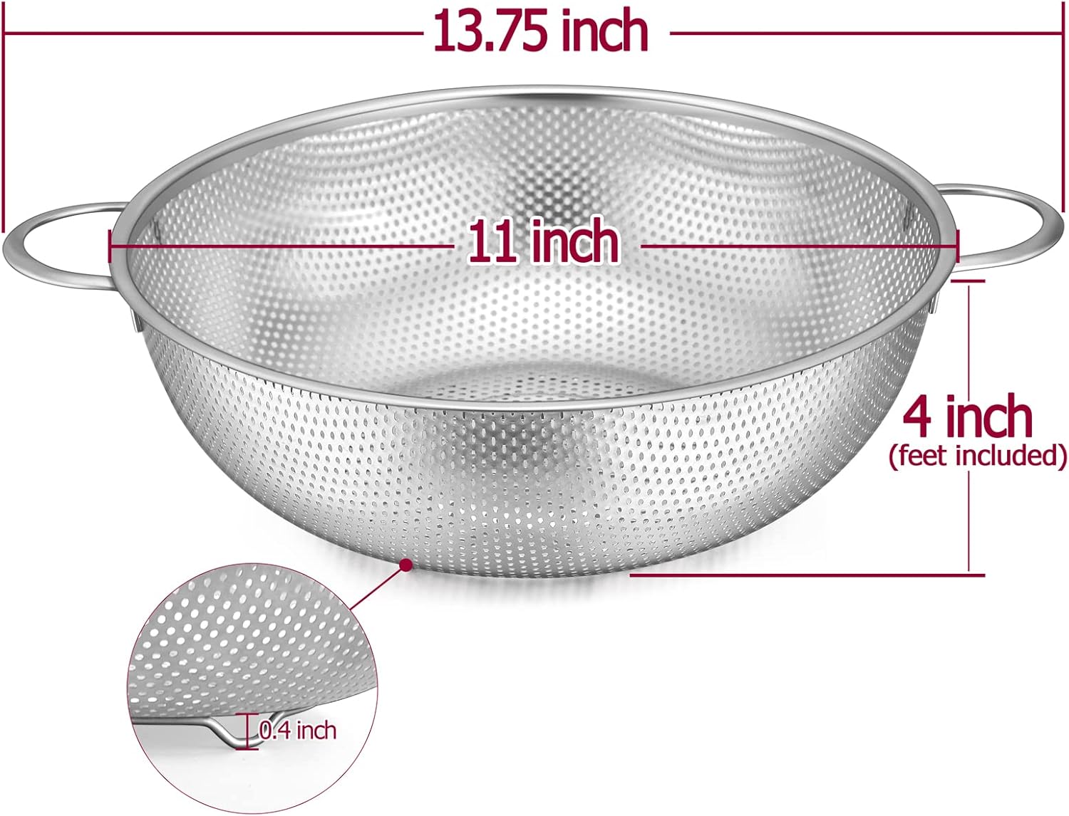 - STABLE FEET – 3 raised feet help the food strainer stand stably on the flat surface and no worry about tipping, 0.4 inch height helps drain all water away from your spaghetti or veggies but won’t touch to the sink