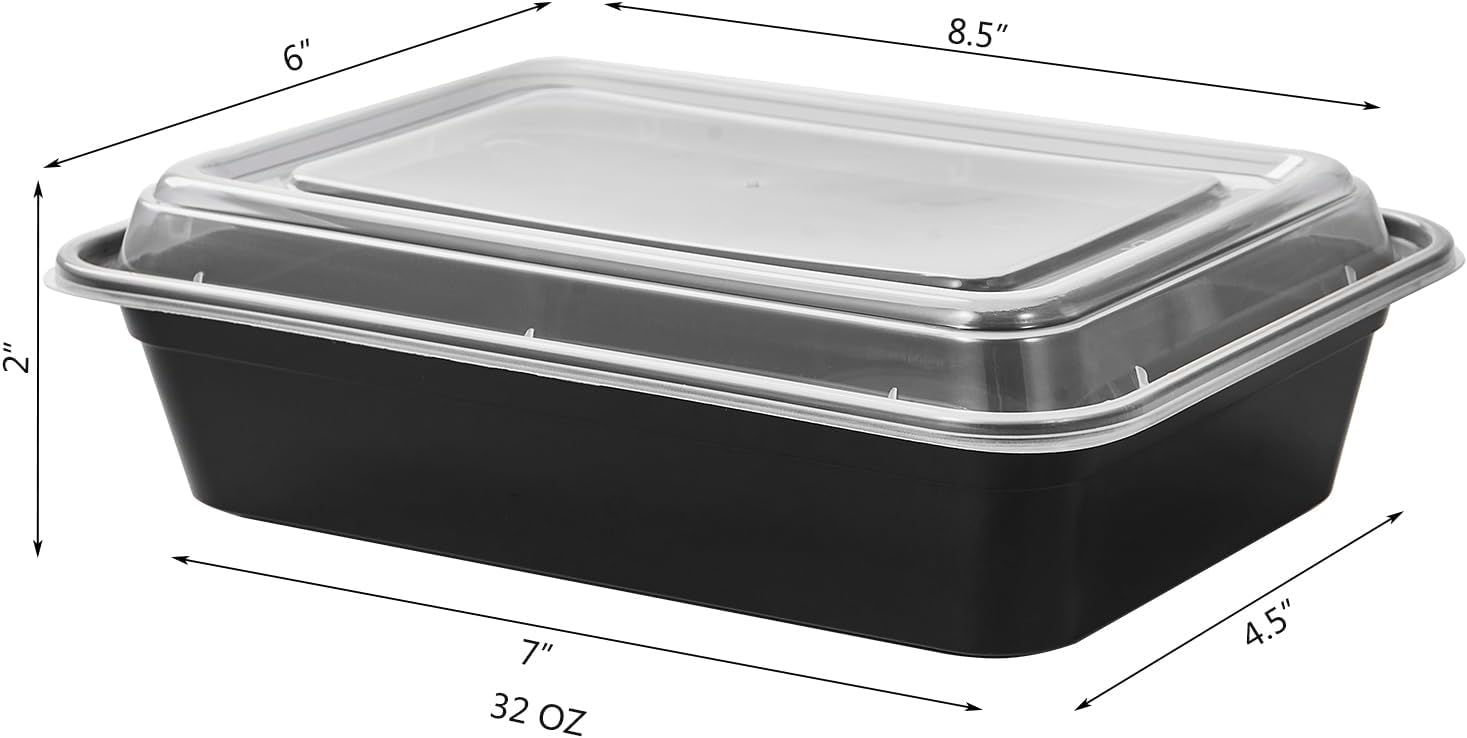 FULING 32 oz 50Pack Plastic Meal Prep Food Storage Containers with Lids Reusable 1 Compartment To Go Lunch Box Black Extra Large &Thick Microwave Freezer Dishwasher Safe BPA Free Stackable