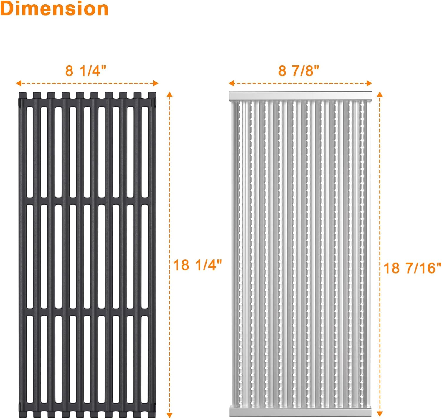 - 【Package】Including 3 pack cast iron cooking grates,18 5/16" x 8 5/16" Each, 18 5/16 x 24 15/16" total; and 3 pack stainless steel Infrared Emitter plate,18 7/16" x 8 7/8" Each, 18 1/4 x 26 5/8" total.