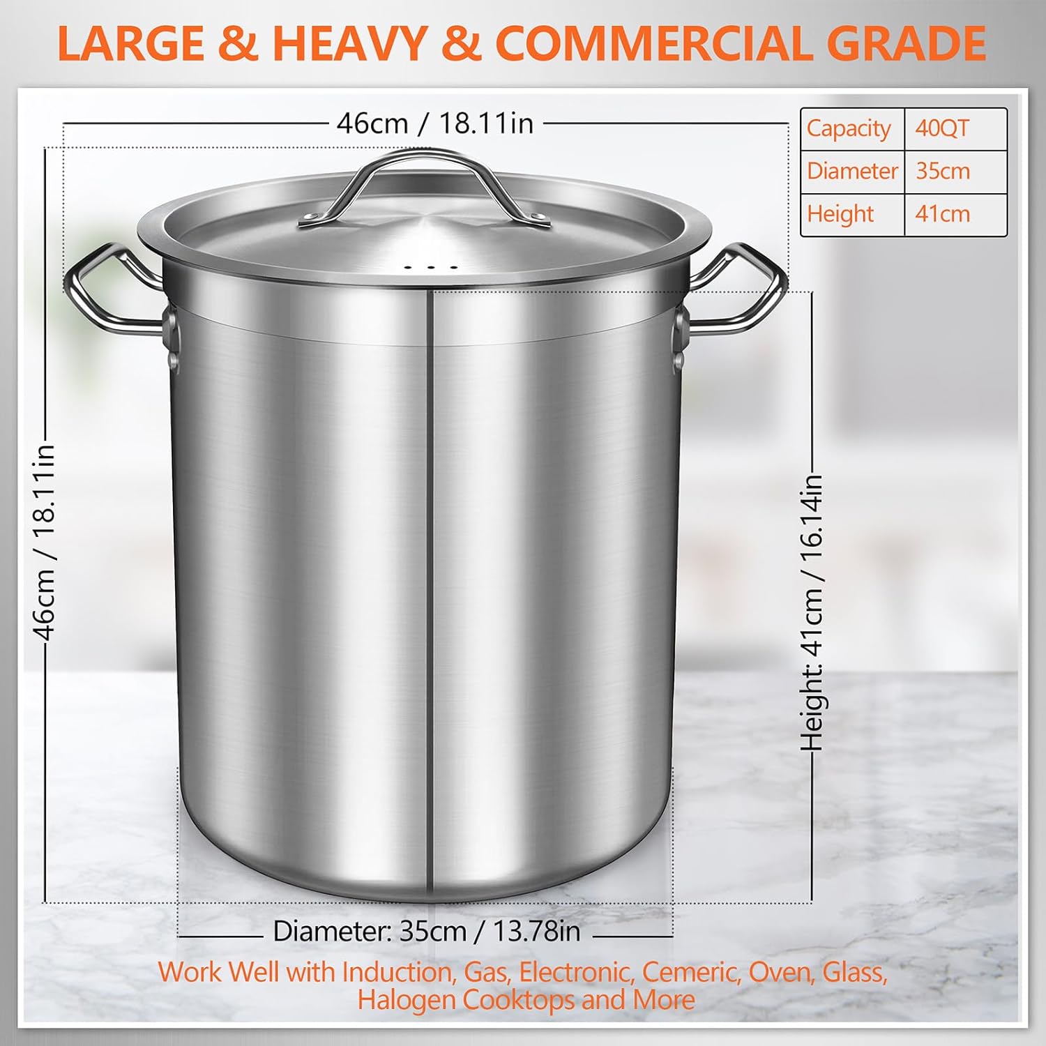 Large Stock Pot with Lid - 40 Quart Stainless Steel Cookware, 10 Gallon Heavy Duty Soup Pot, Big Pots for Cooking, Compatible Induction & Oven