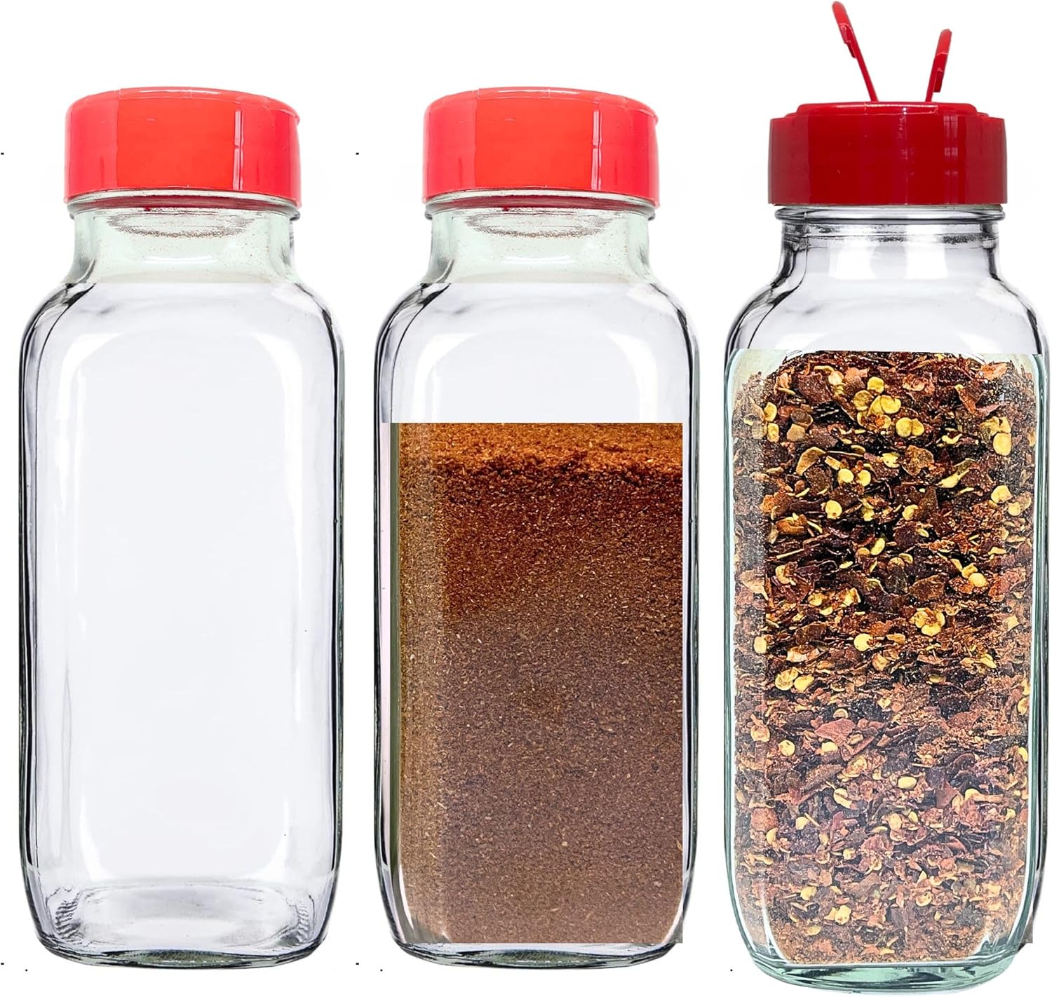 - HEAVY-DUTY GLASS SHAKER BOTTLE: These Empty Glass spice bottles are USA-made. Each features clear glass sides that can be readily personalized with any decorative label. Dual Shaker Holes/Pourer Lid.