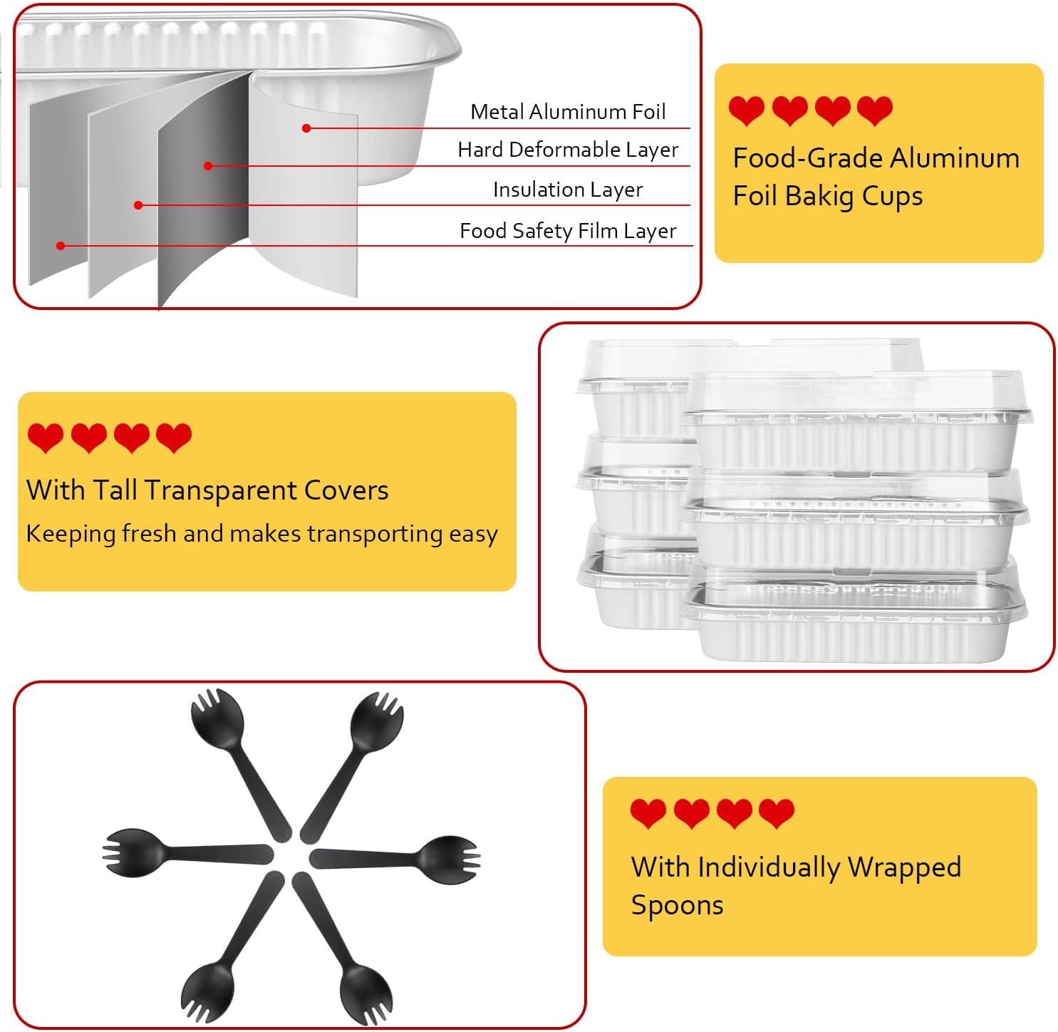- 【Pack of 100 Sets】 - Including 100pcs mini cake pans with 100 clear lids,and 100 individually wrapped spoons.The mini loaf pan size:6.5”x2.5”x1.2”,the dome lids 0.8” high.Abundant small cake pans with lids are great for bake shops,big parties.
