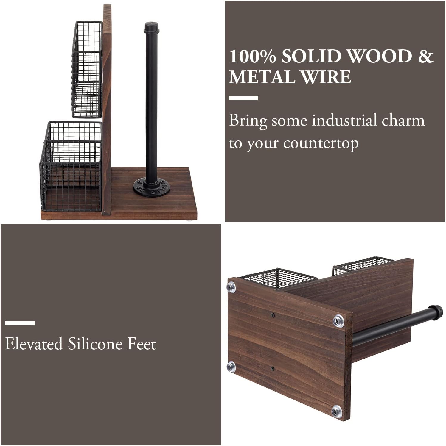 MyGift 3-in-1 Kitchen Organizer with Paper Towel Holder, Napkin Holder & Spice Rack - Rustic Wood & Industrial Metal Pipe Caddy for Farmhouse Dining Table
