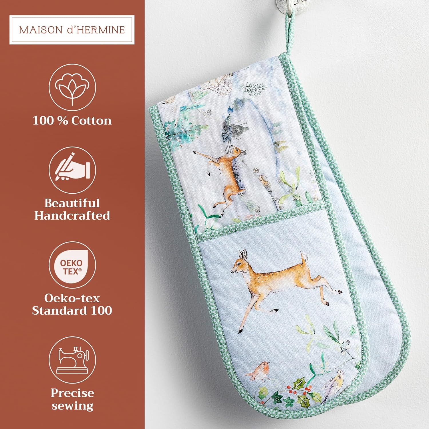 Maison d' Hermine Double Oven Mitts 100% Cotton 7"x35" Double Oven Mitt Heat Resistant BBQ Cooking Gloves with Loop, Baking, Grilling, Home, Kitchen, Handling Hot Pans (Snowy World)