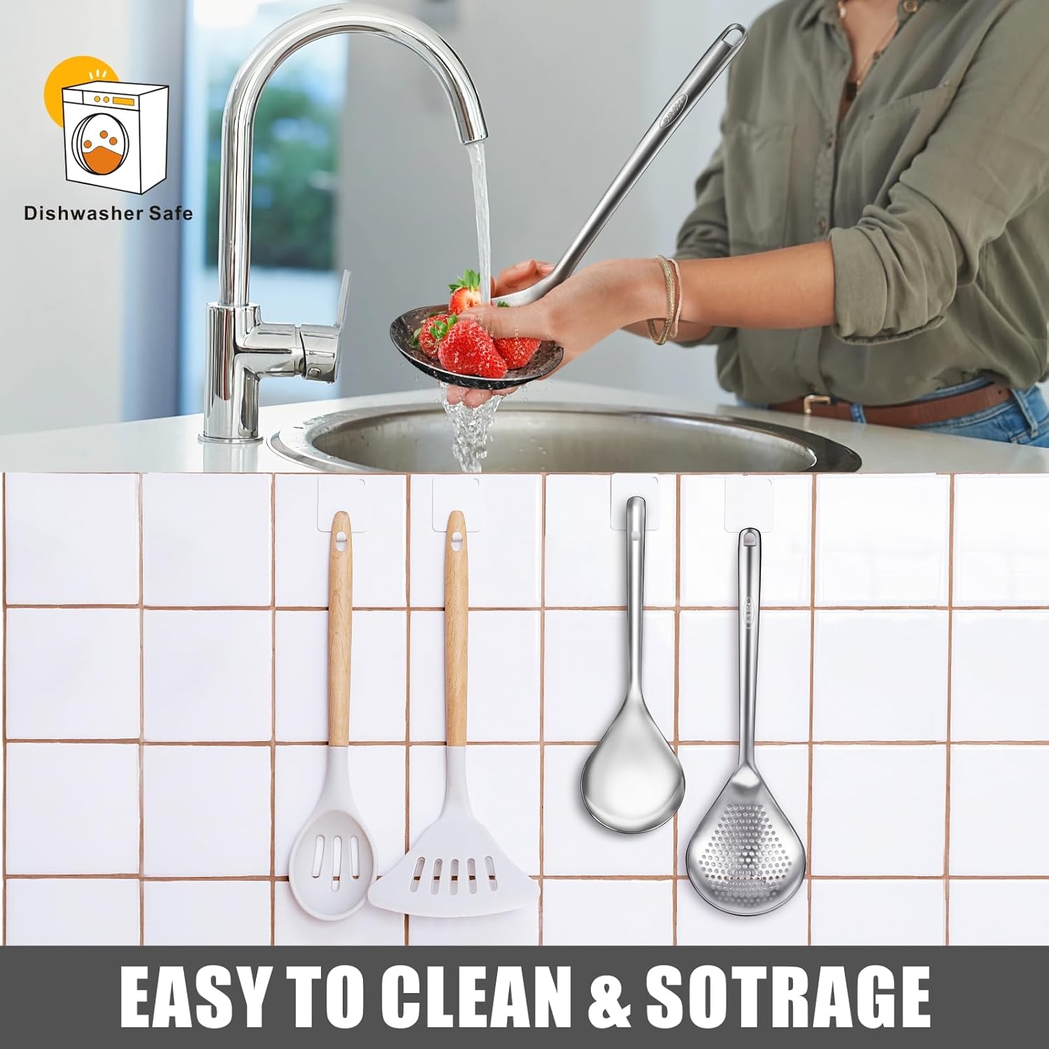 - 【ERGONOMIC HEAT-RESISTANT HANDLE】Ergonomic long handle make the stainless steel cooking spoon and slotted spoon more anti-skid and anti scalding, and prevent your hands from being scratched.