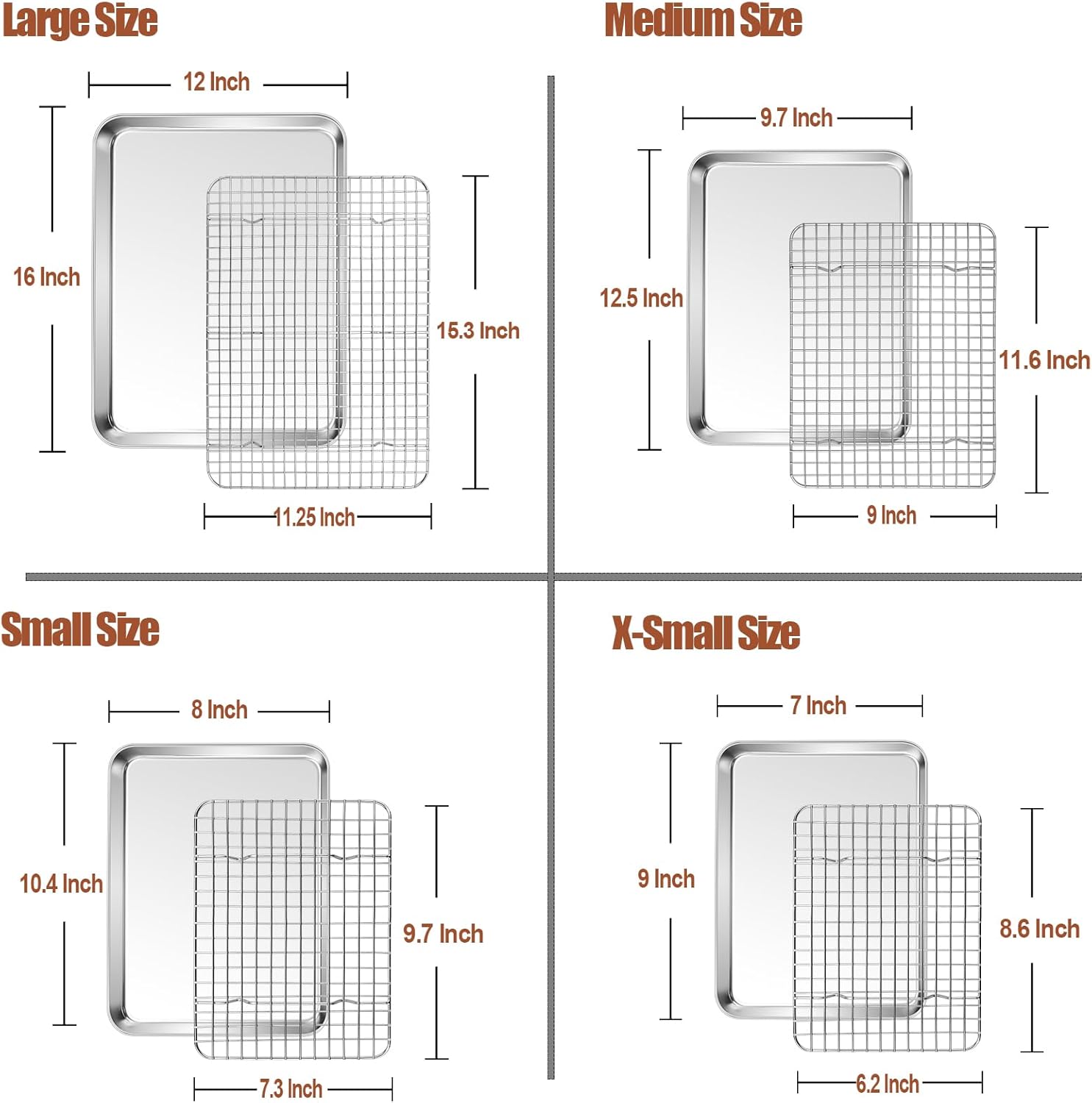 - 【MULTIFUNCTIONAL USE】4 Sizes baking trays and 4 sizes baking racks are ideal for different baking, roasting or cooling needs, Using separately or together is on your choice to create endless possibilities of baking, Using together can keep grease on the pan and get crispy food on the rack, To be a perfect bakeware set of home or restaurant, A thoughtful present for family or friends on anniversary, birthday, wedding, or house-warming