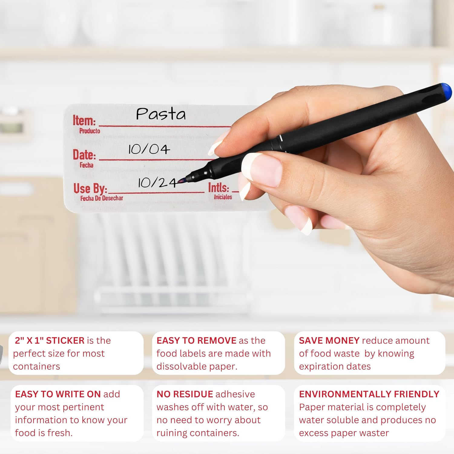- Fully Dissolvable: These labels for food containers dissolve completely in water, whether in the dishwasher or under running water, leaving no sticky residue behind. They are perfect for labeling food containers or freezer storage and can be effortlessly removed after use.