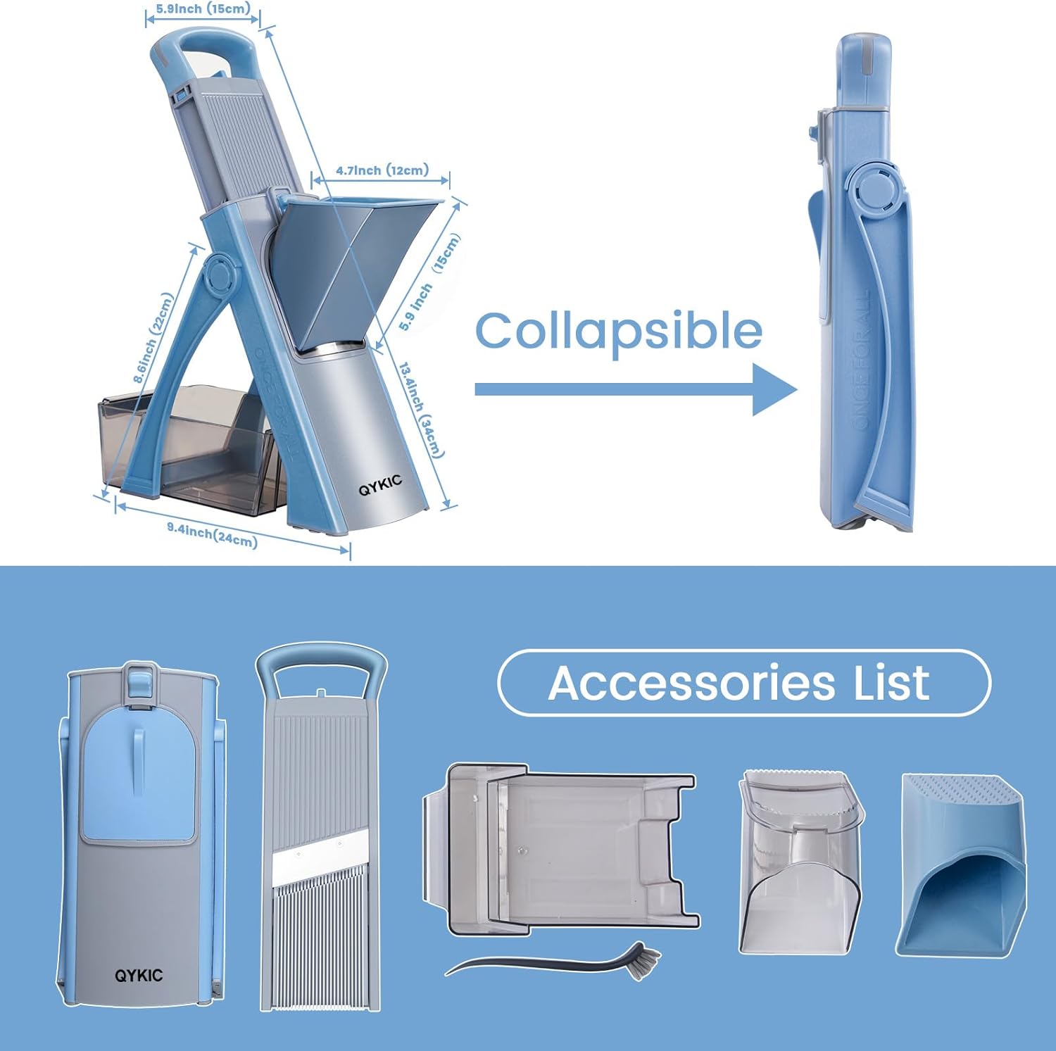 - ✅MULTIFUNCTIONAL : QYKIC vegetable chopper and slicer with 100+ slicing options, the mandoline slicer cuts perfectly-even slices from 0.2-8mm in thickness while also offering julienne, matchstick and dicing options. suitable for cutting potatoes, garlic, onion, carrot, cucumber, vegetables and fruits. tips: please do not cut meat.