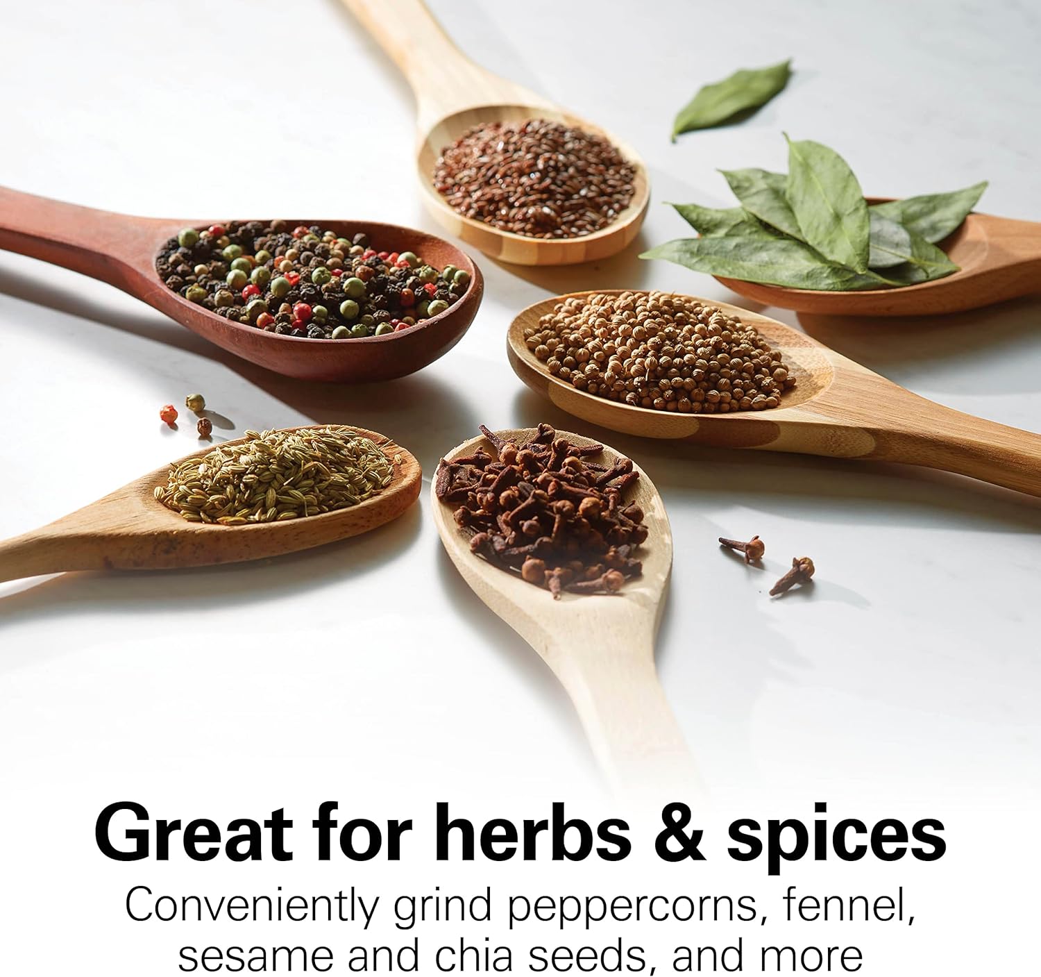 - DURABLE STAINLESS STEEL BLADES: With the durable stainless steel blades, this small coffee grinder makes easy work of grinding everything from coffee beans to herbs and spices.