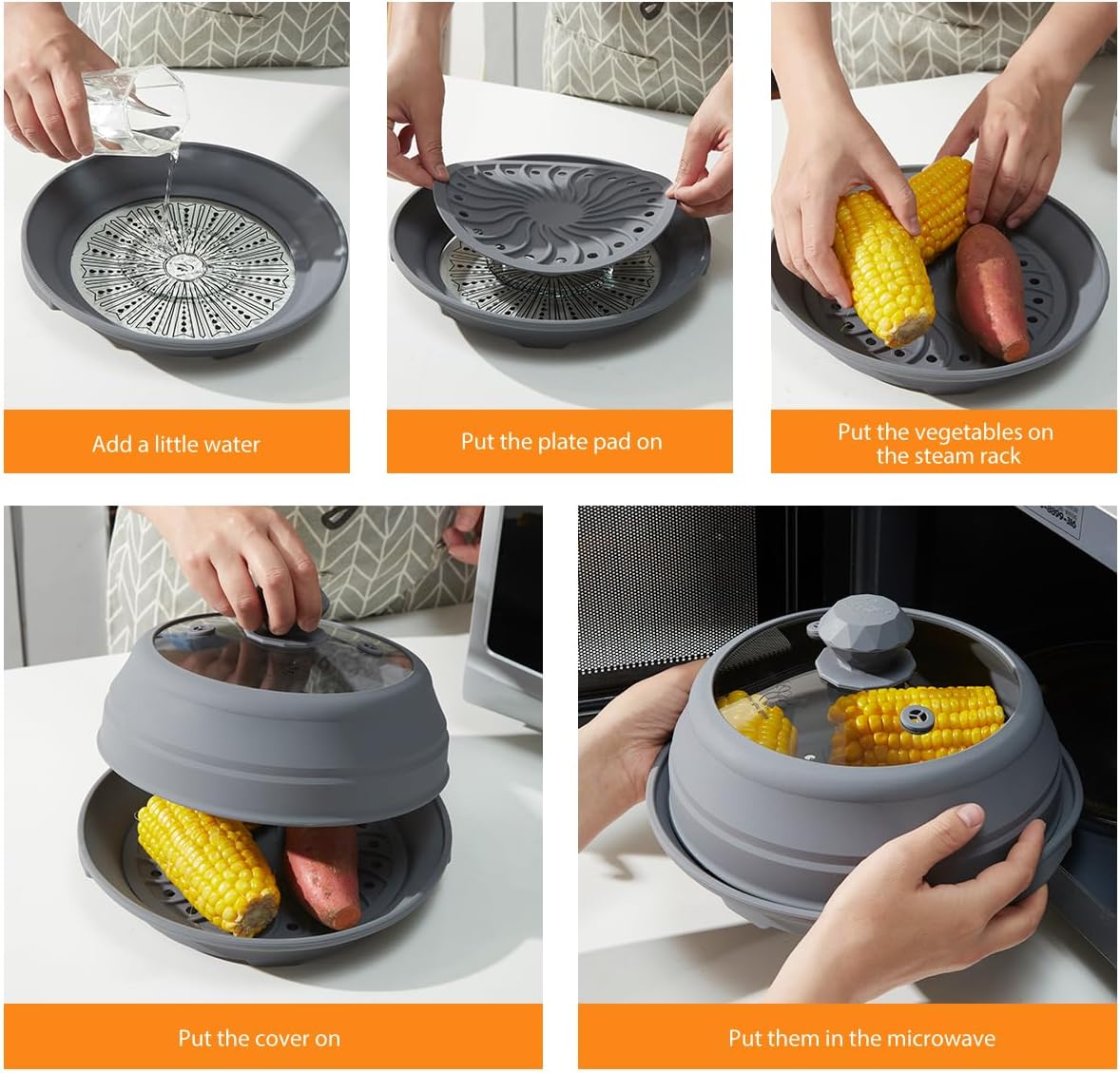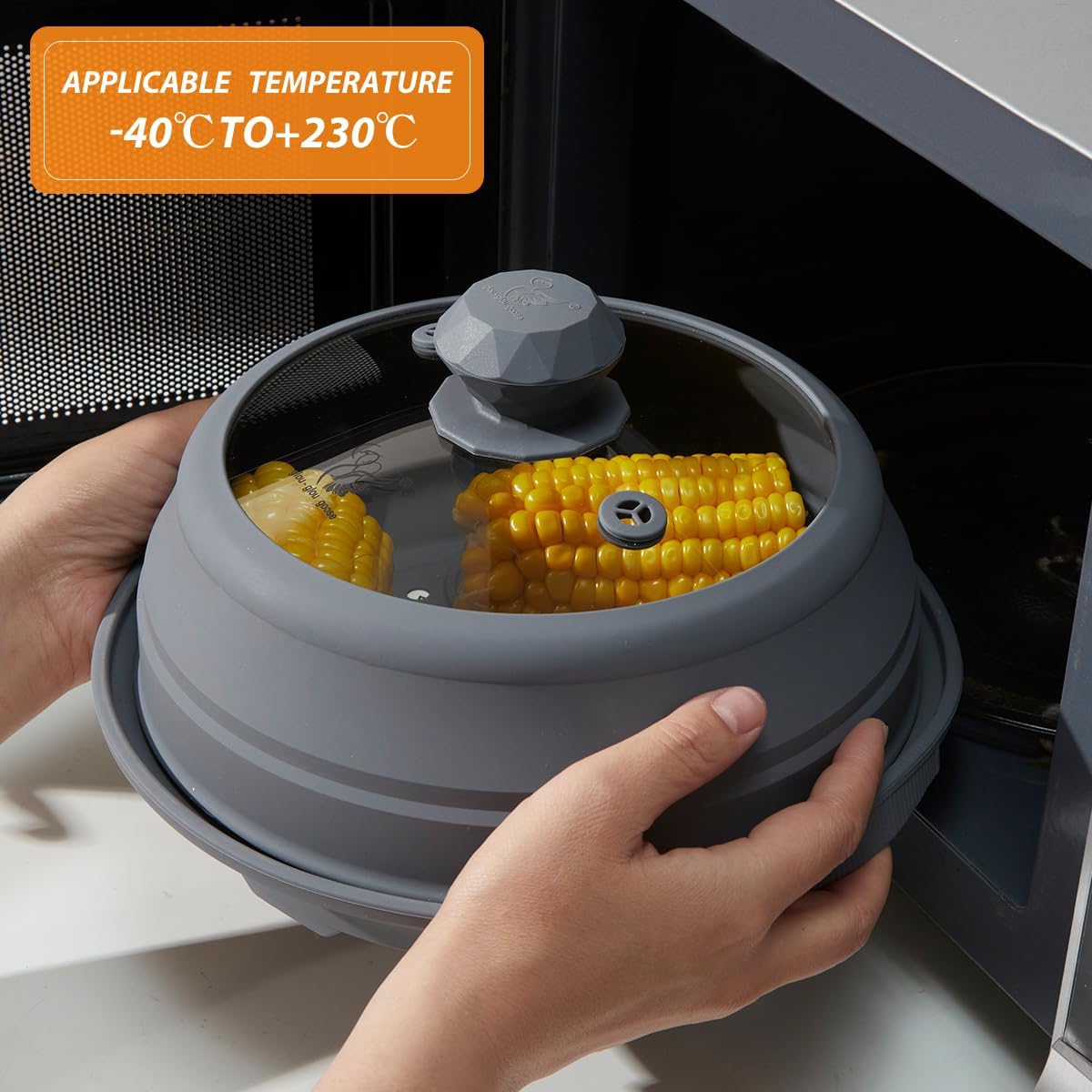 Microwave Splatter Silicone Cover Collapsible, Vented Multifunction Splash Lid with Glass Dish Bowl Plate for Food Cooking Bacon Maker, Dishwasher Safe BPA-Free 9 inch Cookware Set Grey