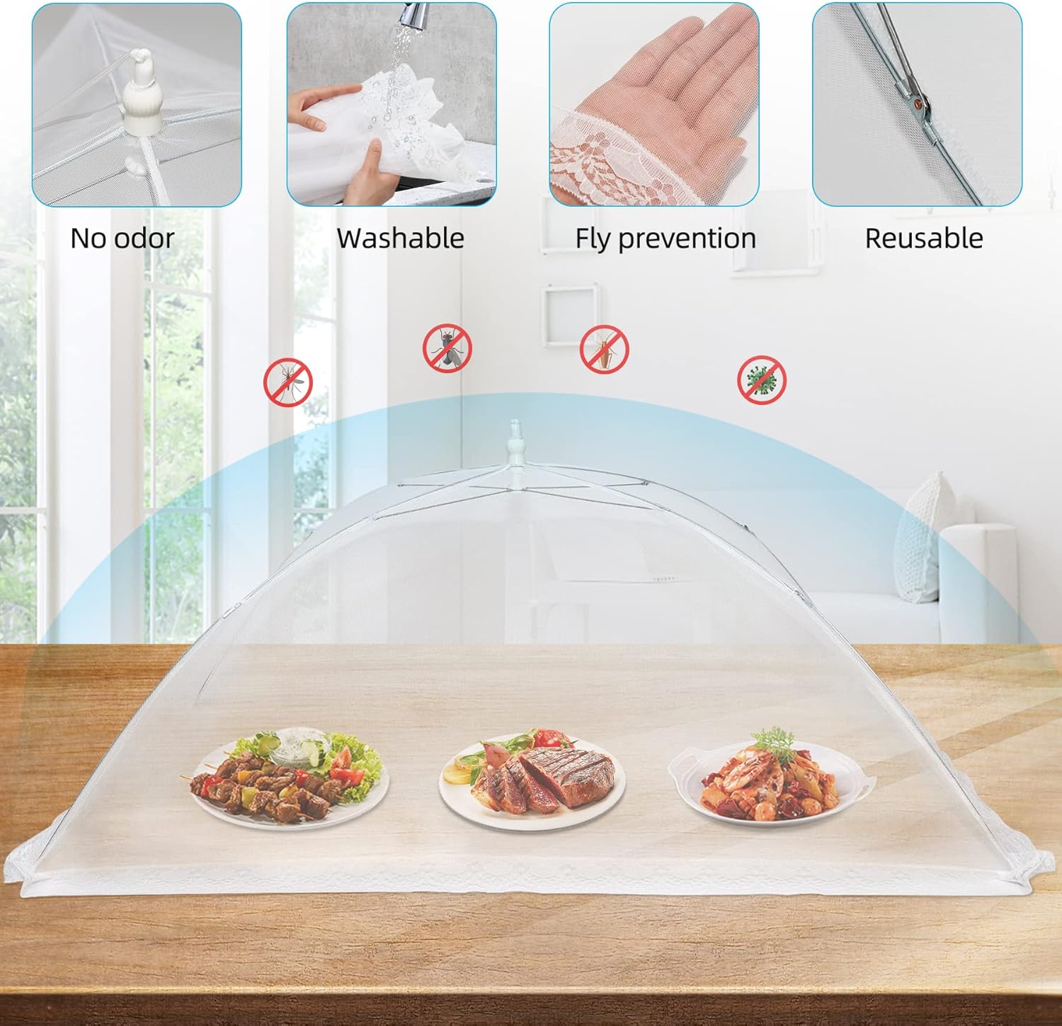 - FOOD COVERS FOR OUTSIDE: use food tent cover to cover the tent to cover indoor and outdoor dishes. Put the freshly baked bread on the counter to cool to ensure the safety of fruit and salad. At the same time, it can be used to protect seedlings or mature fruits in vegetable gardens. It can be seen through ventilation that water and air can flow freely.