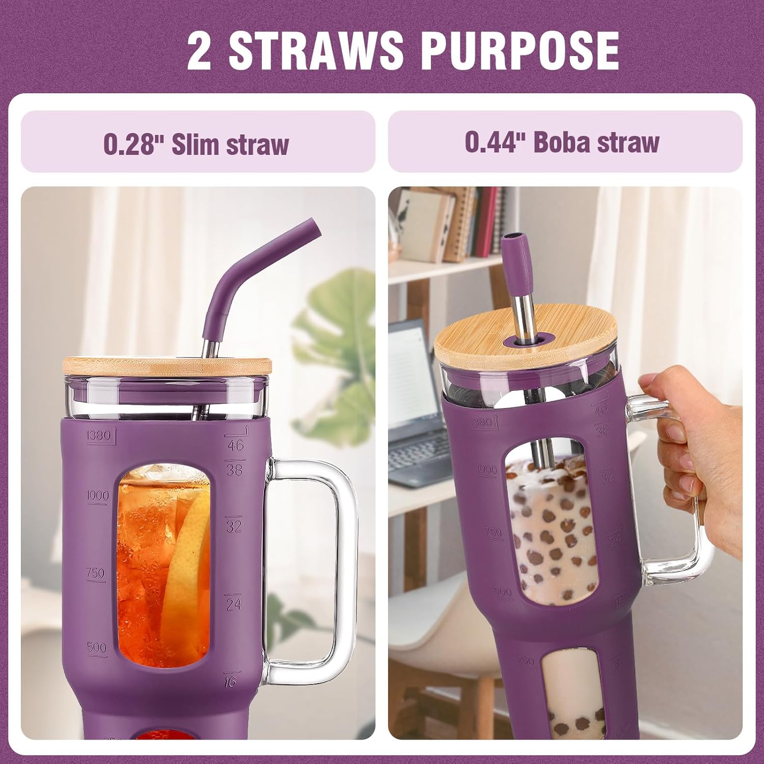 Glass Tumbler with Lid and Straw, 46 oz Iced Coffee Cup with Handle, Glass Water Bottles with Silicone Sleeve, BPA Free-Purple