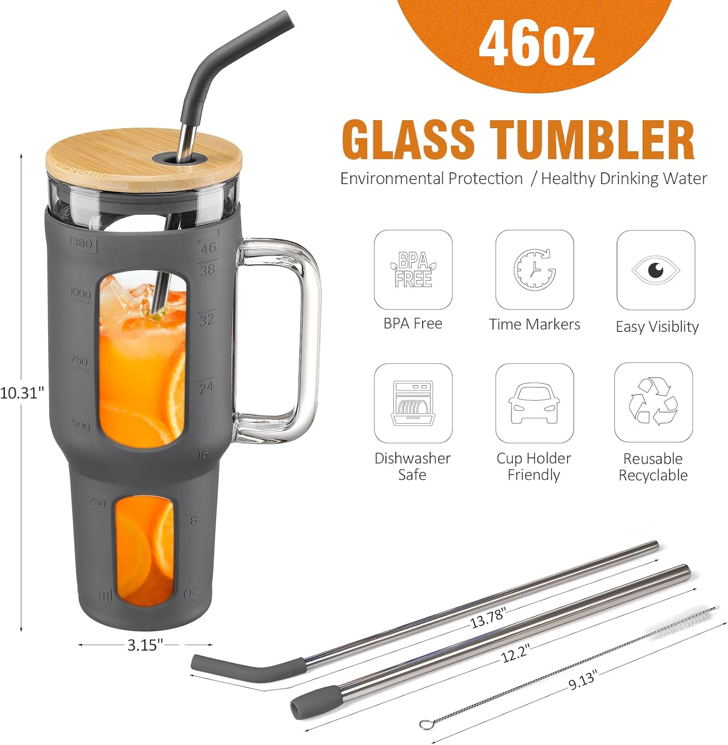 Glass Tumbler with Lid and Straw, 46 oz Iced Coffee Cup with Handle, Large Water Bottles with Silicone Sleeve, Glass Cup with Straws - Pearl Straw & Drinking Straw BPA Free-Grey