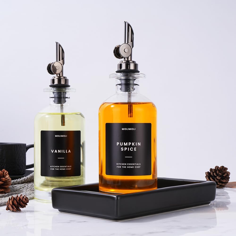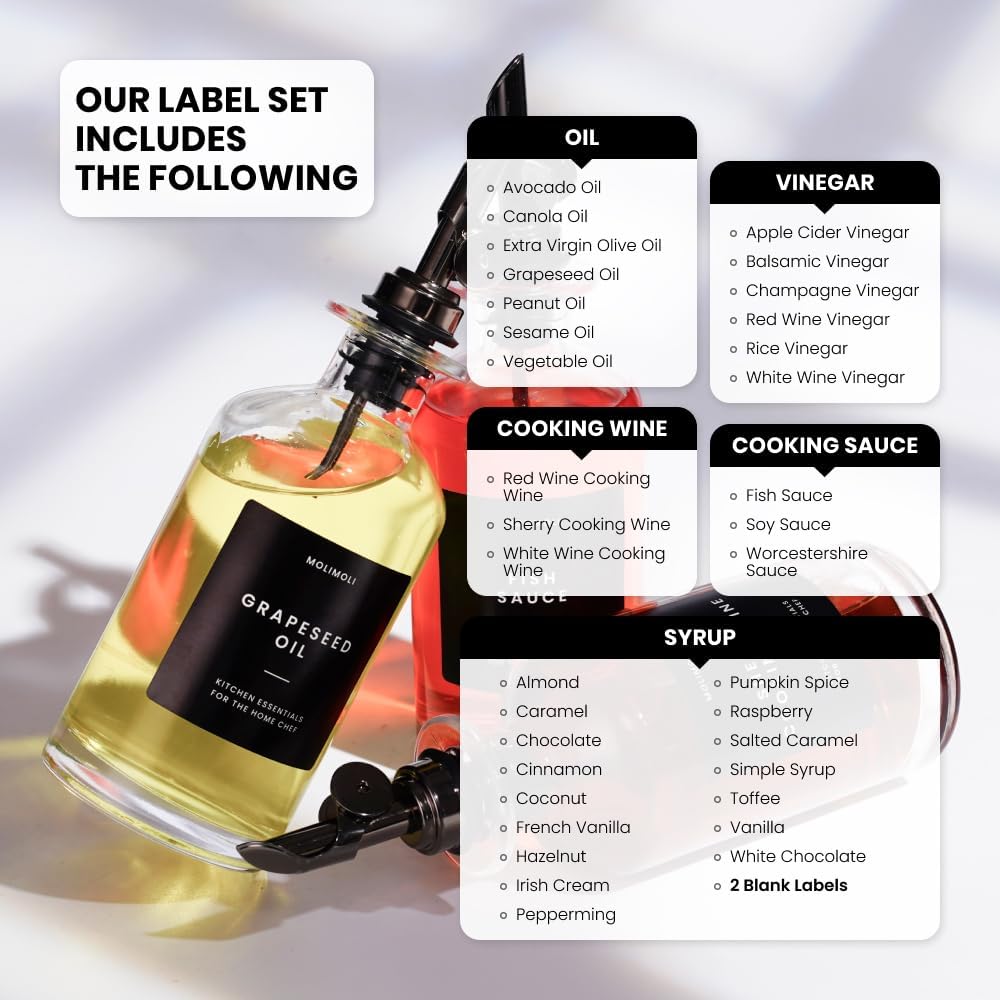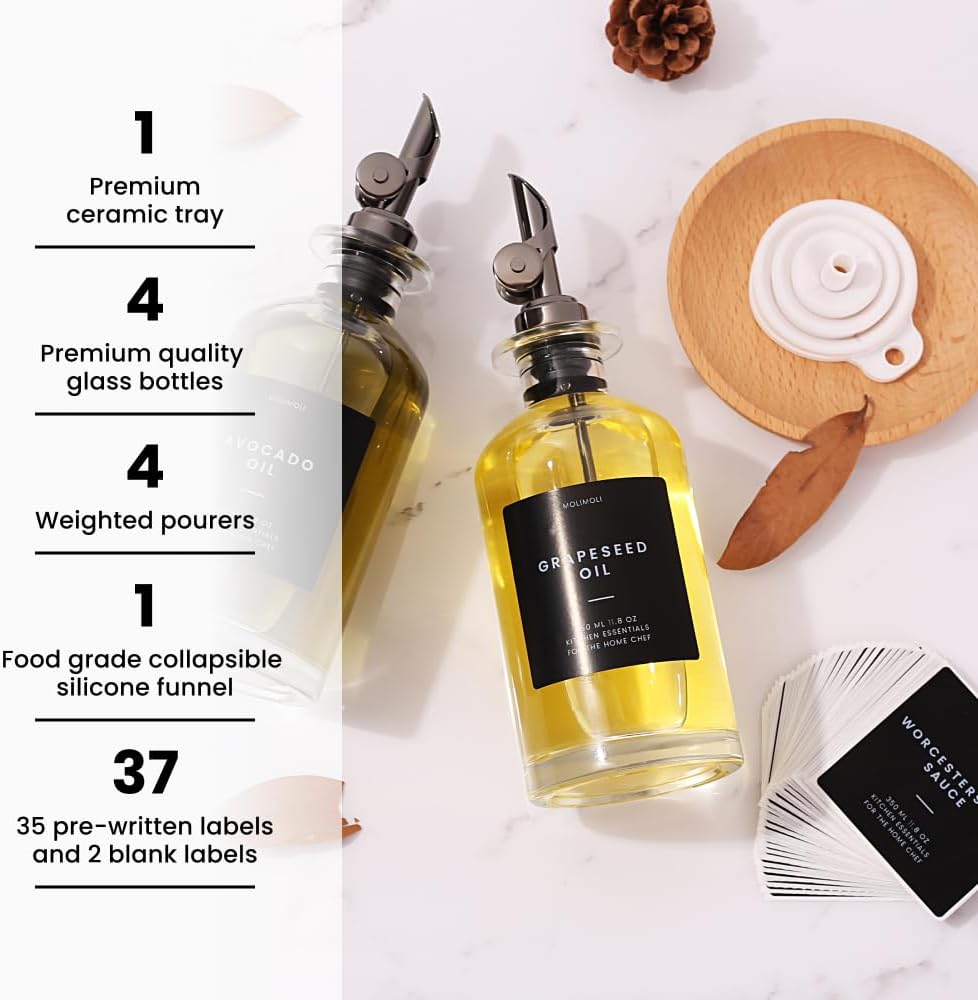 - Modern Kitchen Essential: Minimalism Inspired Cooking Oil Dispenser Bottle. This Set Includes Two High-quality 11.8 Oz (350 Ml) Glass Bottles, Two black Pourers, a funnel, and a 22 Label Set. If you received white label set, please contact us at hello@officialmolimoli with your order #, we will send a black set to you ASAP.