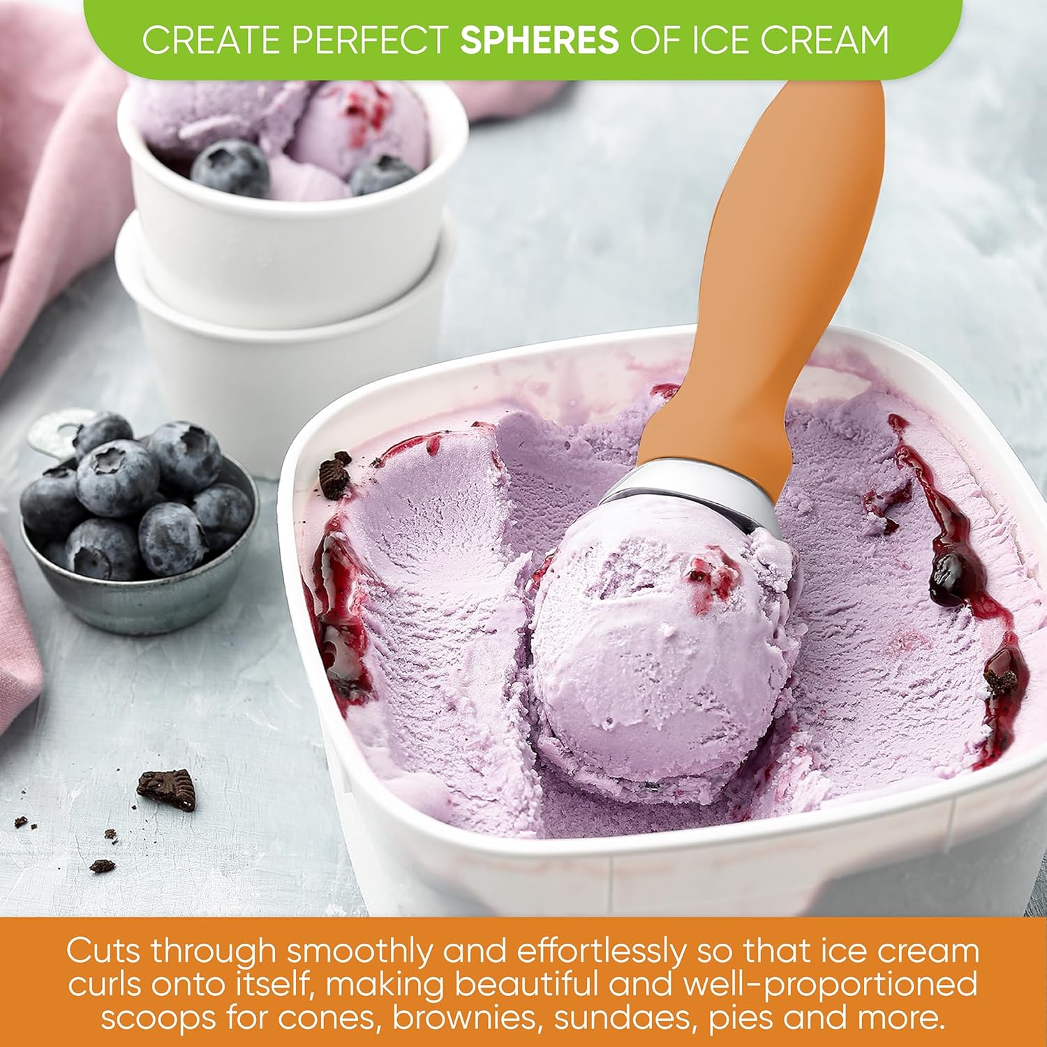 - Create Perfect Spheres Of Ice Cream (2 Pack) - Cuts through smoothly and effortlessly so that ice cream curls onto itself, making beautiful and well-proportioned scoops for cones, brownies, sundaes, pies and more. You'll receive 2 scoops so you can enjoy 2 different flavors at the same time.