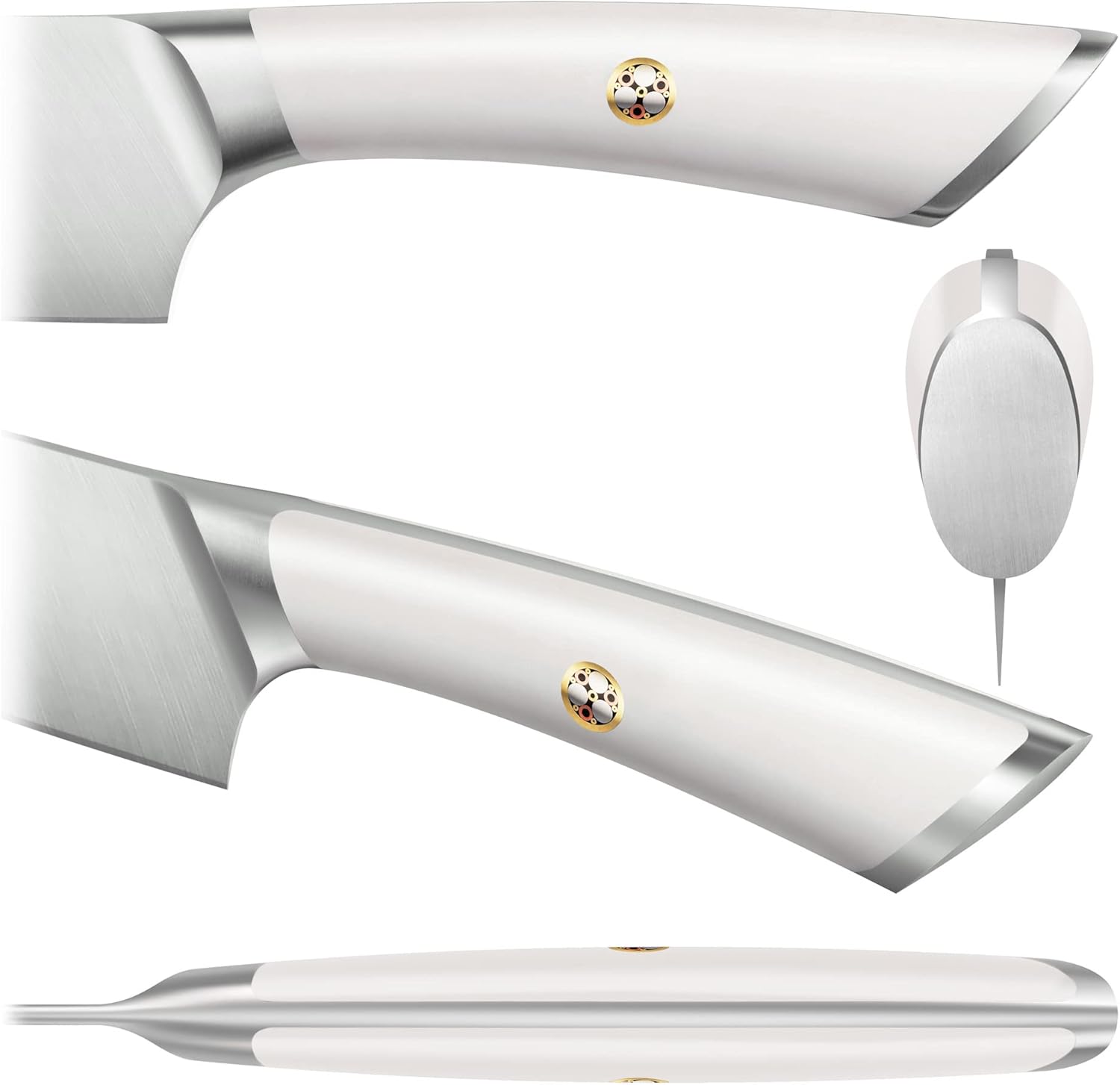 - Handcrafted full-tang knives forged from tight-grained X50CrMoV15 German Steel for incredible durability, stain resistance, and exceptional edge retention.