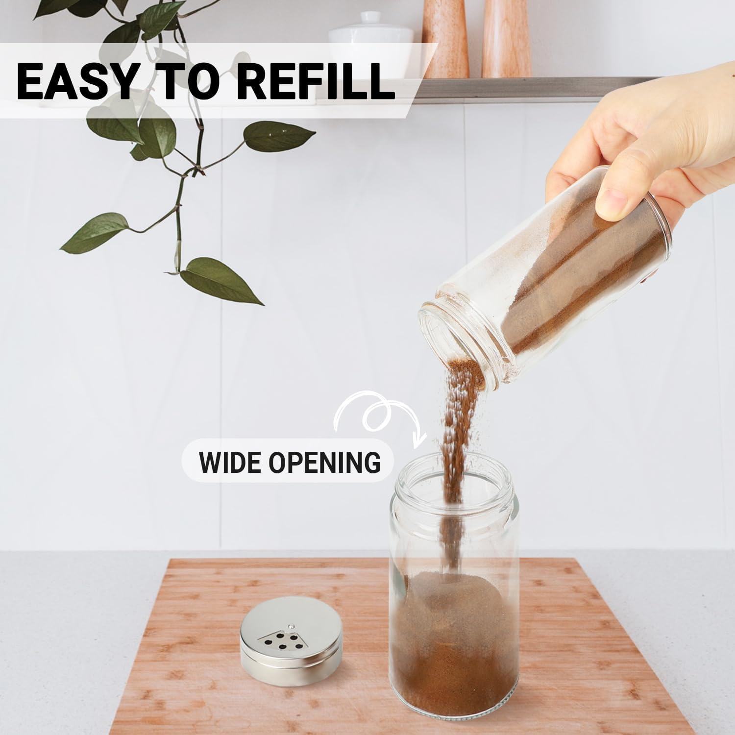- Durable and Sturdy Glass Spice Containers: Our seasoning containers are crafted from high-quality thickened glass, ensuring their durability and sturdiness. Seasoning shakers protects the spices from light, moisture and air, keeping them fresh and flavourful for longer. The transparency of the glass spices jar ensures that you can clearly see the spices in the bottle, so that you can refill it in time.