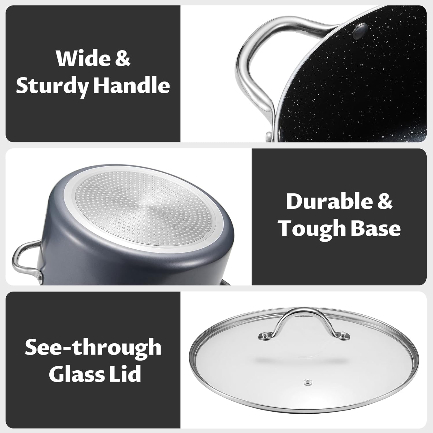 - Tight-Seal Shatter-Resistant Glass Lid: Perfect for the large pot for cooking, it enhances efficiency & allows clear progress monitoring during the cooking process.