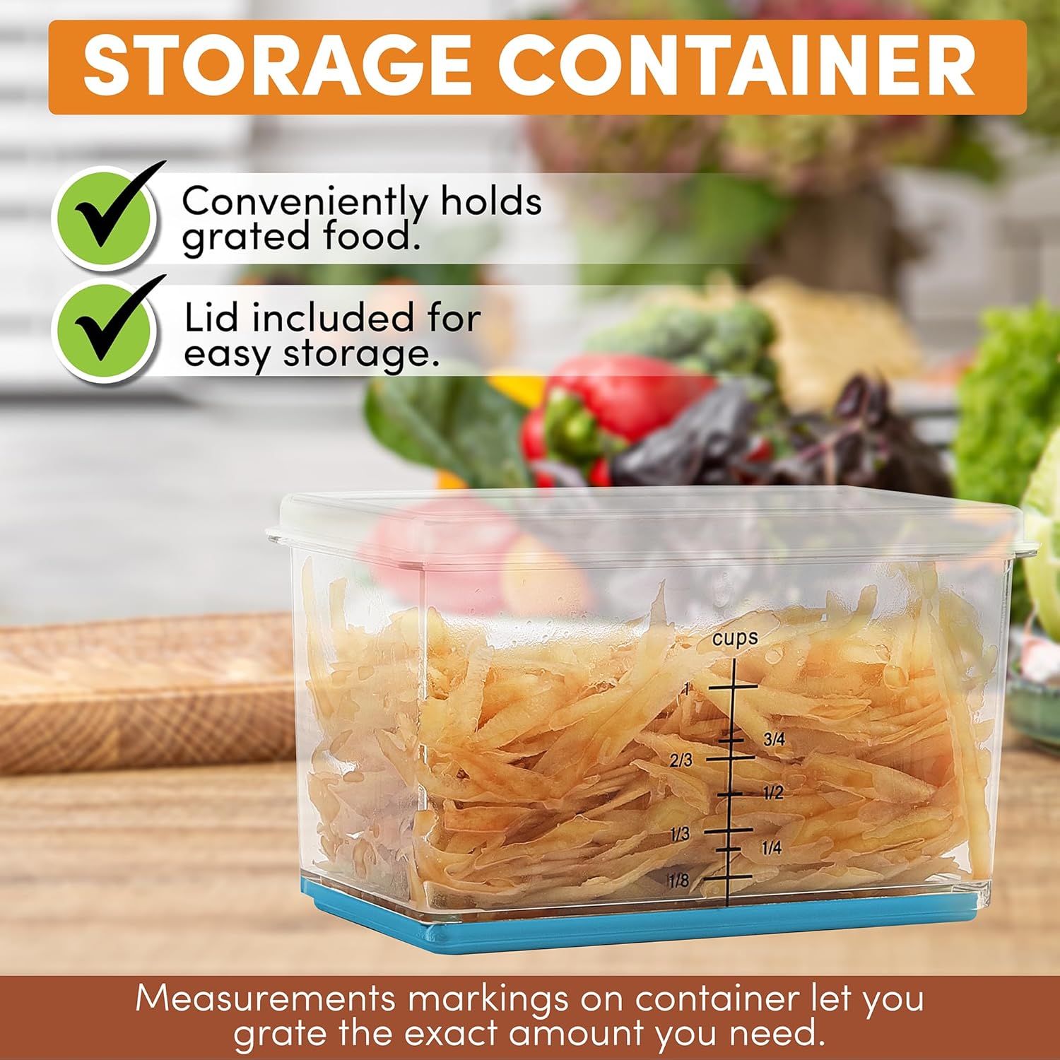 - Included Storage Container With Lid: The included storage box lets you grate directly into the container and store it with the lid. The container also has measurement markings on the side so you can get the perfect amount.
