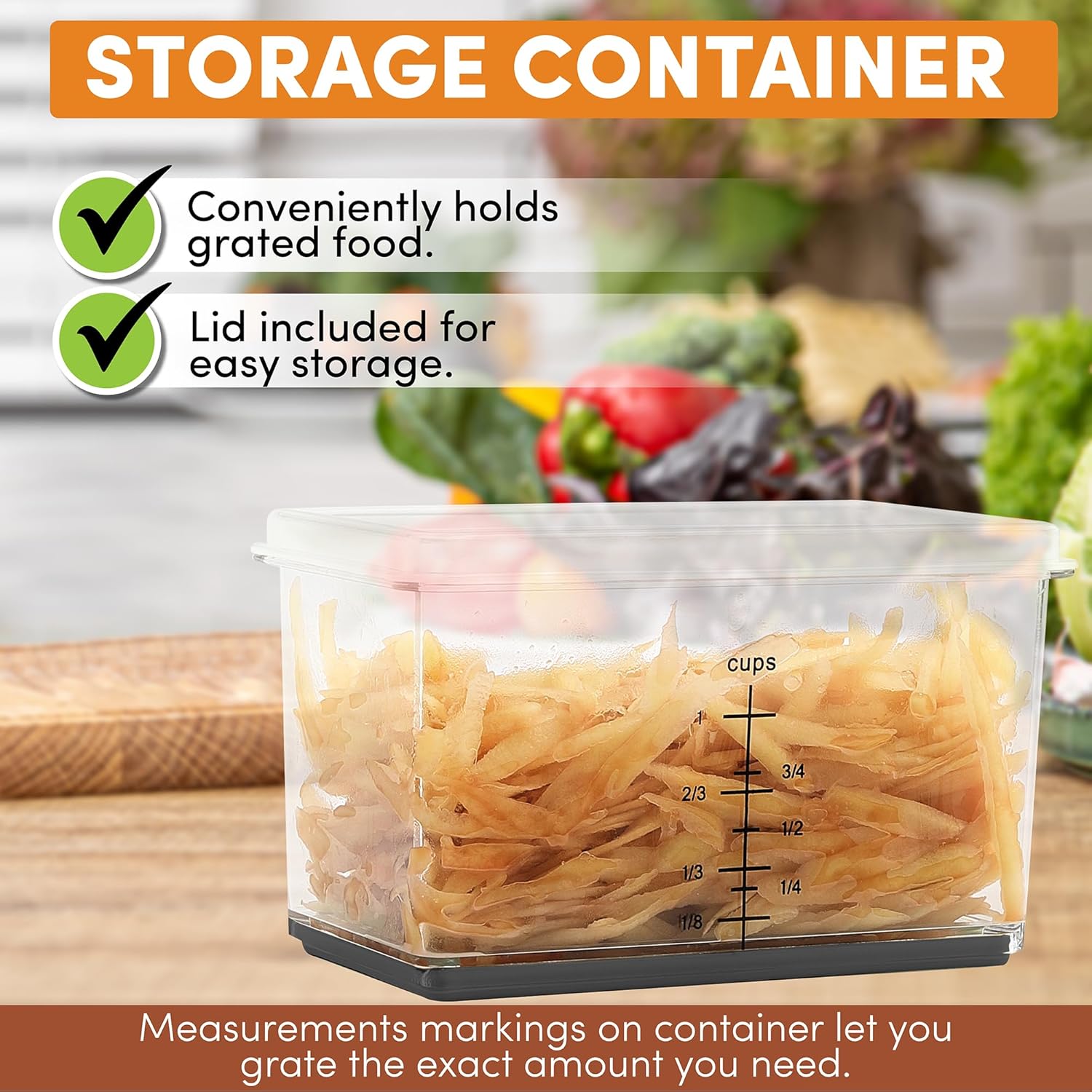 - Included Storage Container With Lid: The included storage box lets you grate directly into the container and store it with the lid. The container also has measurement markings on the side so you can get the perfect amount.