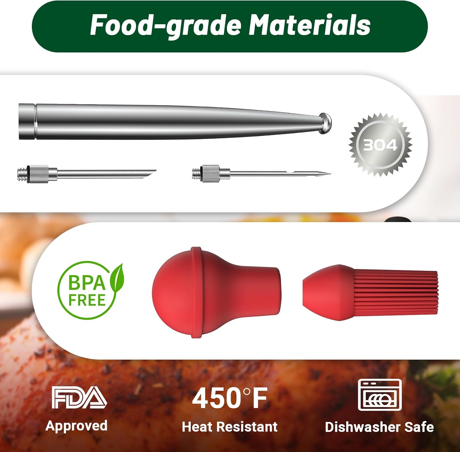 Vondior Turkey Baster for Cooking, Food Grade Stainless Steel Turkey Baster Syringe with Barbecue Basting Brush and 2 Marinade Injector Needles and Cleaning Brush, Red
