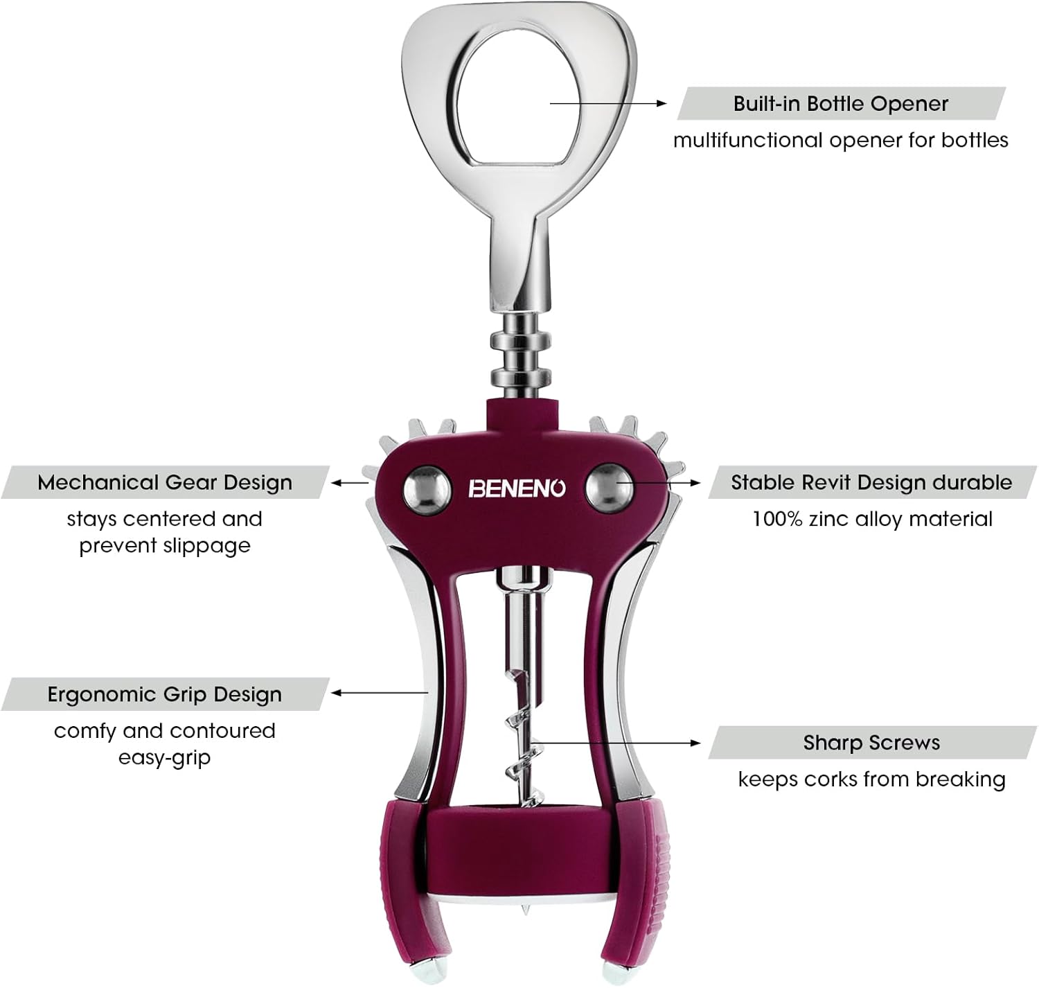 Beneno Wine Opener, Zinc Alloy Premium Wing Corkscrew with Multifunctional Bottles Opener, Sharp Wine Corkscrew with Ergonomic Non-Slip Wing Handle, Upgrade Purple