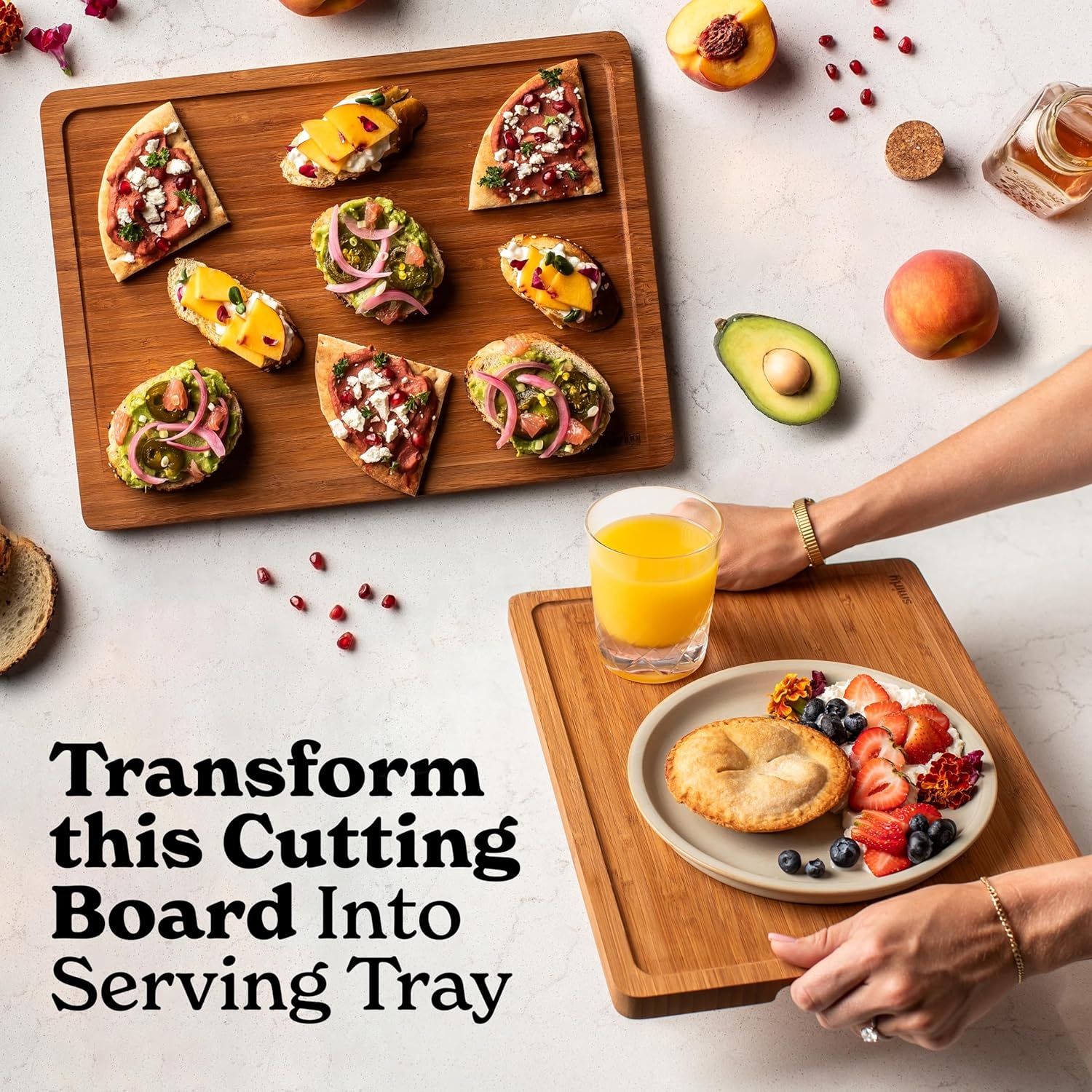 - Less Work and No Worries - Juice grooves on our wood cutting board catch excess liquid, protecting your counters. Ergonomic handles make it easy to grip, while bamboo cutting boards for kitchen resist nicks, ensuring superior sanitation and easy cleaning.