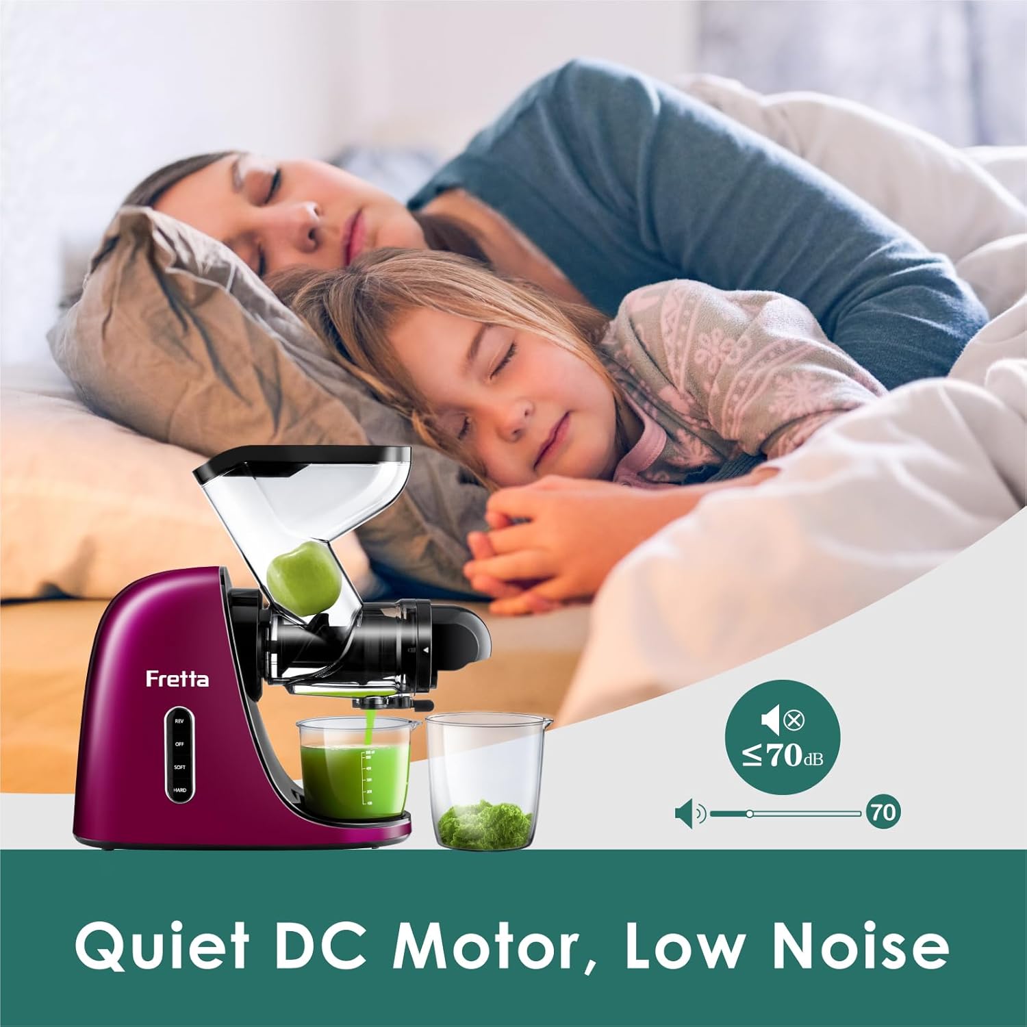 - 【 Powerful yet Quiet DC Motor】Fretta's masticating juicer machines are powered by a robust 200W DC Motor. Its high-torque, low-speed design operates quietly at low RPM, extracting deep nutrition from your favorite fruits and veggies. Enjoy a peaceful juicing experience with noise levels below 70 decibels.