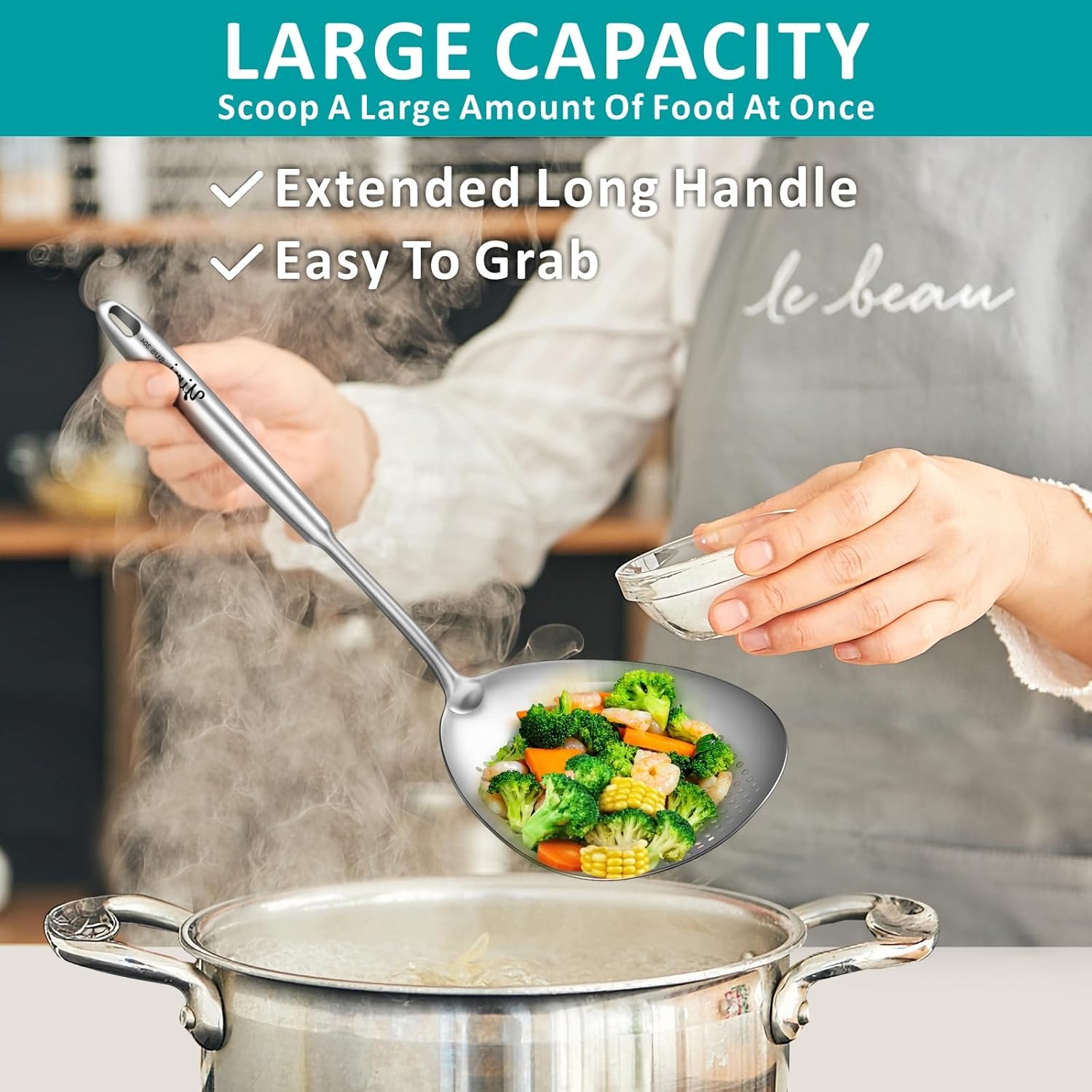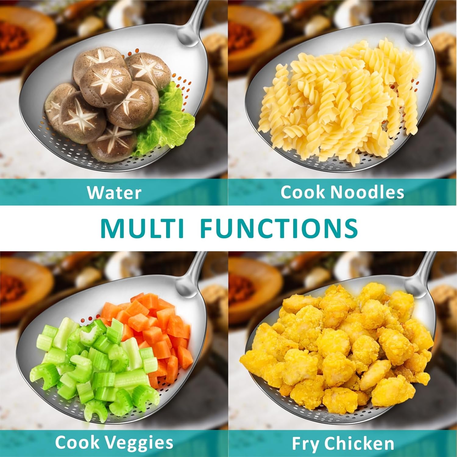 Large Deep Skimmer Slotted Spoon, Real SUS304 Stainless Steel Pasta Strainer, Colander Spoon with Big Draining Holes, Deep Fryer Scoop for Frying, Cooking, Draining, Ideal for Gift, 15''