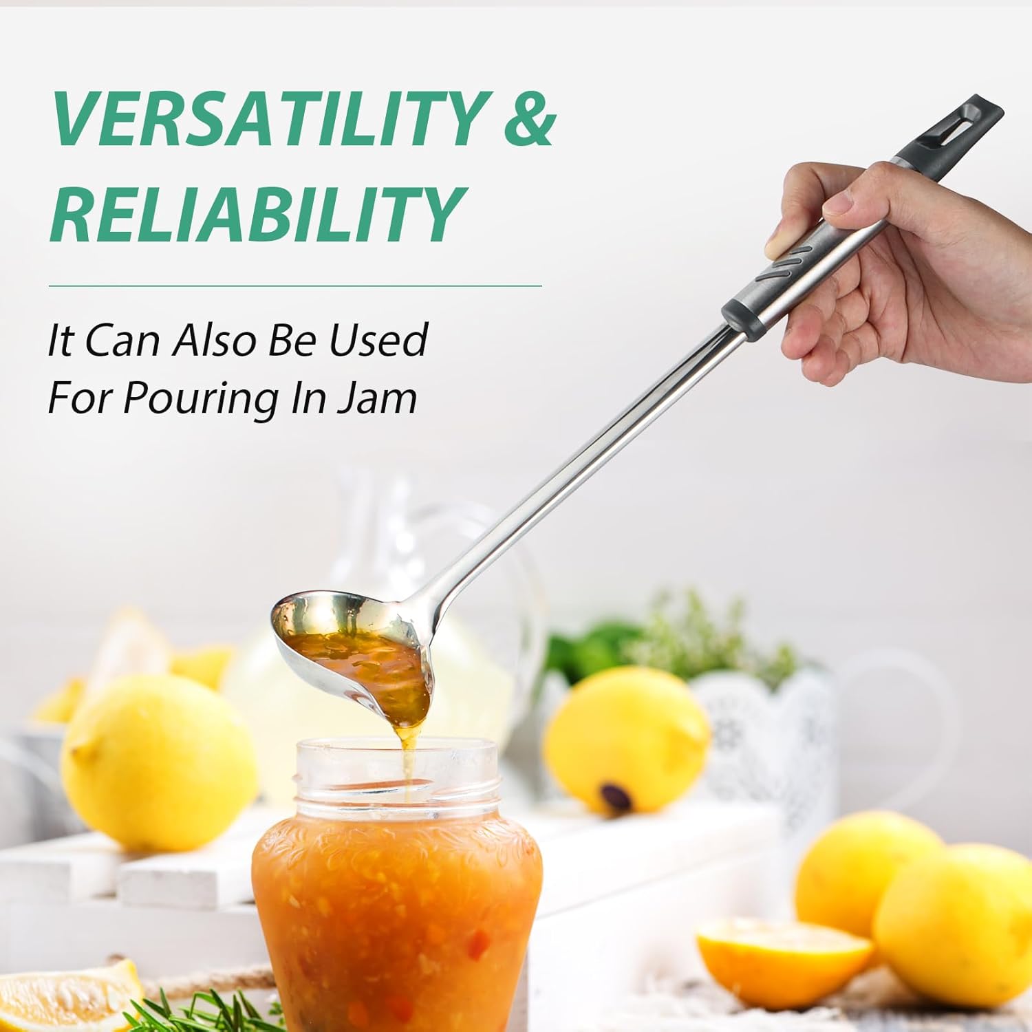 - 【FOOD-GRADE MATERIAL】Made of food-grade stainless steel, the sauce spoon can come into contact with gravies or soups for a long time. Meanwhile, it is also a canning ladle
