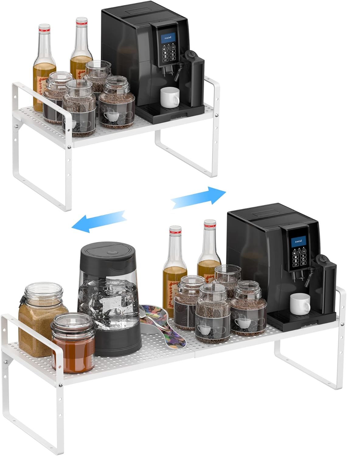 - 【Expandable and stackable design】--The Adjustable Countertop Organizer (collapsed) measures 16.5" L x 8" W x 9.8" H, expands from 16.5" to 27.5" length. You can also stack two shelves together to create a two-tier storage space.